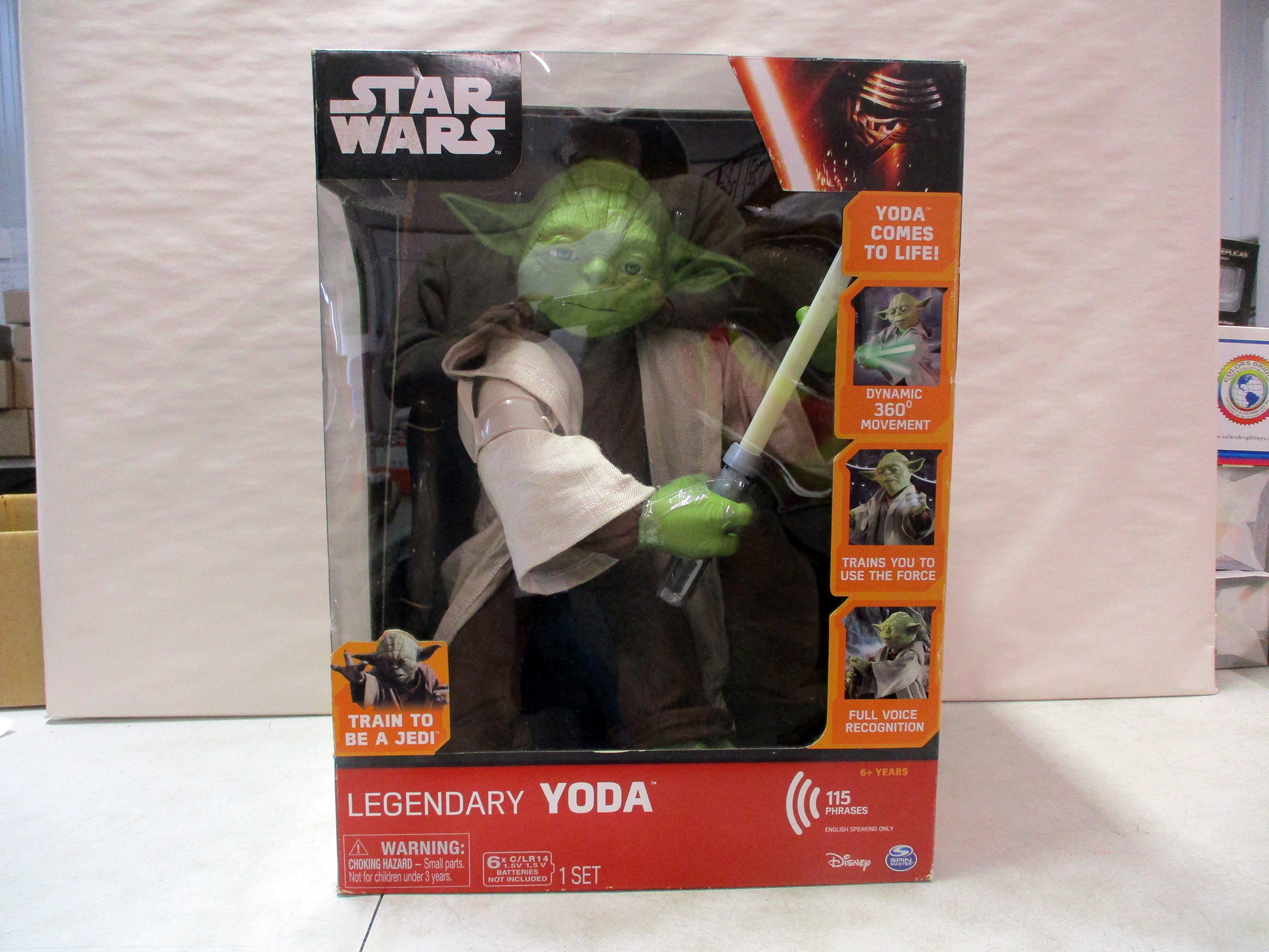Star Wars Legendary Yoda interactive toy featuring lifelike movements and speech. The figure is approximately 16 inches tall, includes a light-up lightsaber, and has over 115 phrases to guide users in training to become a Jedi. Battery-operated and originally produced by Spin Master under the Disney and Lucasfilm licensing. Packaged in original unopened box. (Click image to see high resolution version).