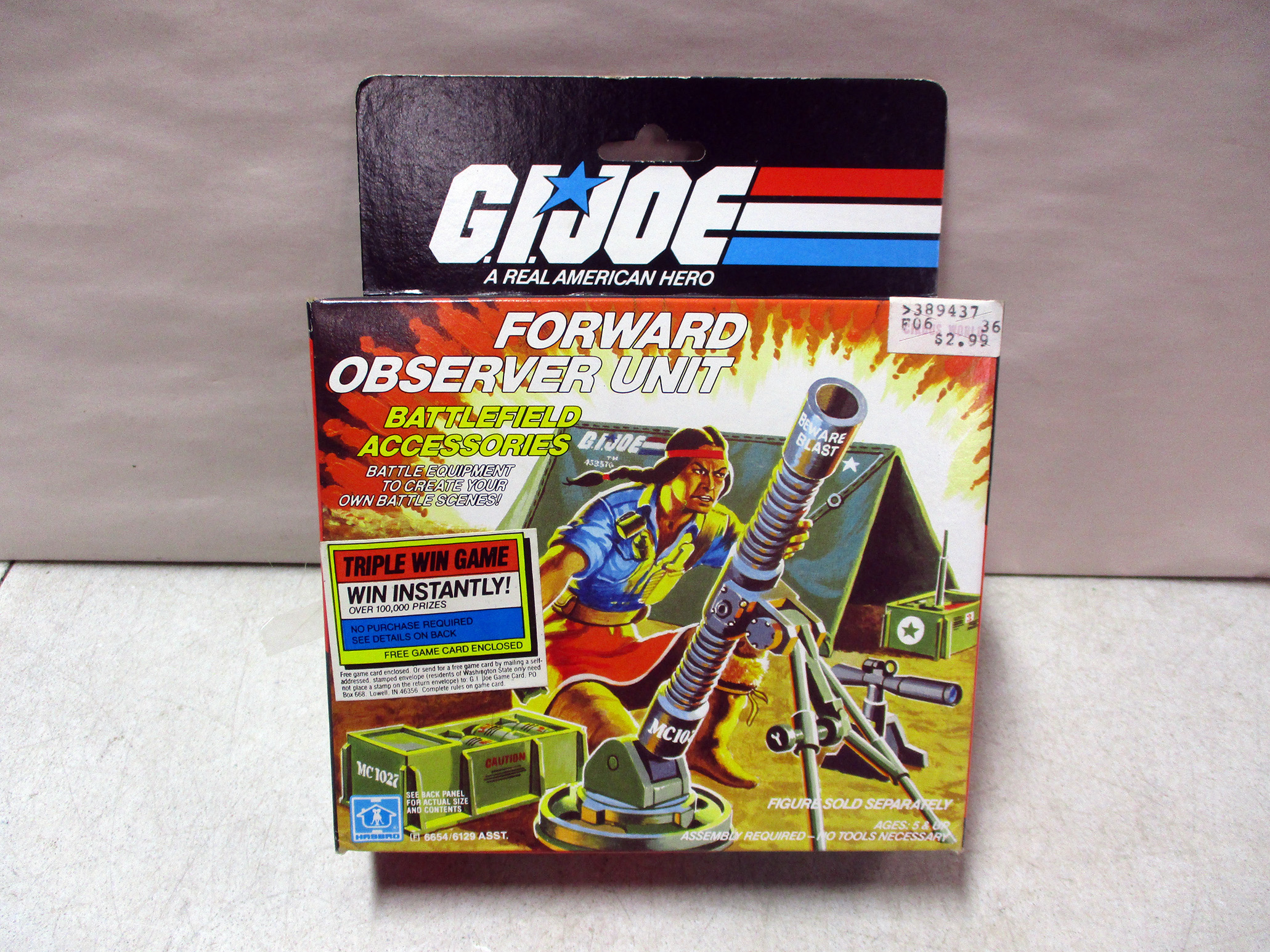 G.I. Joe Forward Observer Unit Battlefield Accessories set, part of the A Real American Hero series by Hasbro. This vintage set includes a mortar launcher, binoculars, crates, and other accessories to enhance play or collection displays. Packaging appears intact and unopened with vibrant graphics. (Click image to see high resolution version).