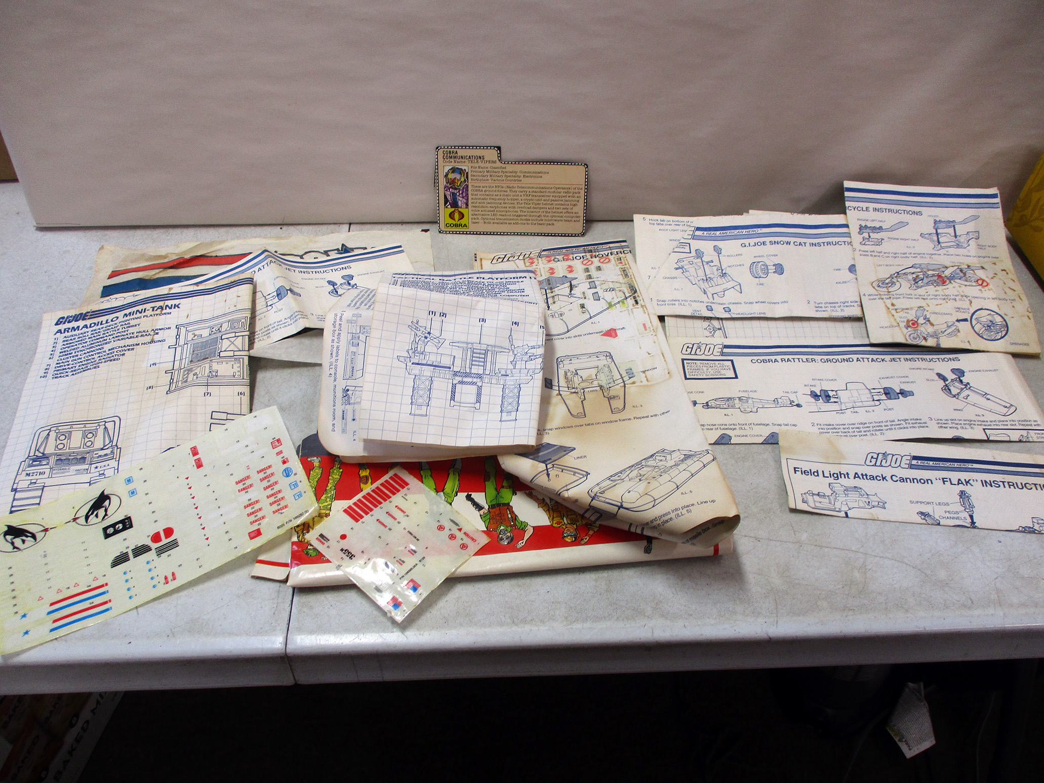 GI Joe manuals, instructions, decals, and related printed materials, featuring various diagrams and layouts for assembly and customization. Includes unused decal sheets with vibrant color details. Condition varies with some wear and creasing evident on the paper materials. Vintage and collectible items for hobbyists or collectors. (Click image to see high resolution version).