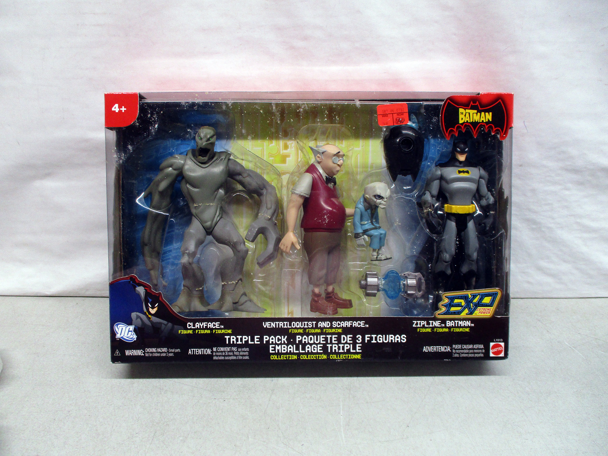 Batman action figure triple pack from the "The Batman" series, featuring Dr. Ravencroft, Ventriloquist & Scarface, and Zipline Batman. Set comes in its original unopened packaging, suitable for collectors or fans. Produced by Mattel and recommended for ages 4 and up. (Click image to see high resolution version).