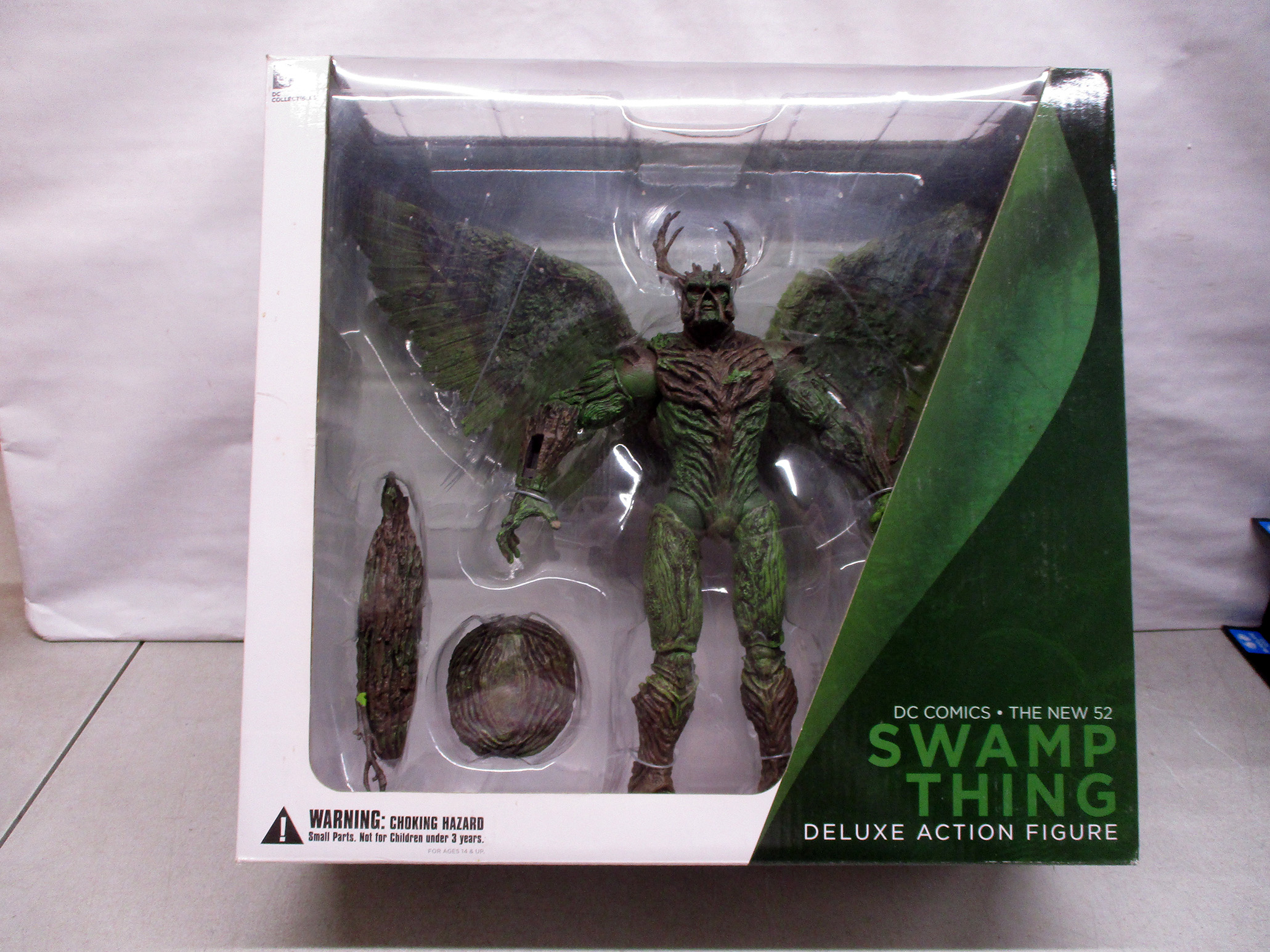 DC Comics The New 52 Swamp Thing deluxe action figure. Includes a high-quality green figure with detailed wings, horns, and additional accessories. Packaged in original box with clear window display. Manufactured for the DC Collectibles line featuring intricate design and craftsmanship. A must-have for comic book collectors. (Click image to see high resolution version).