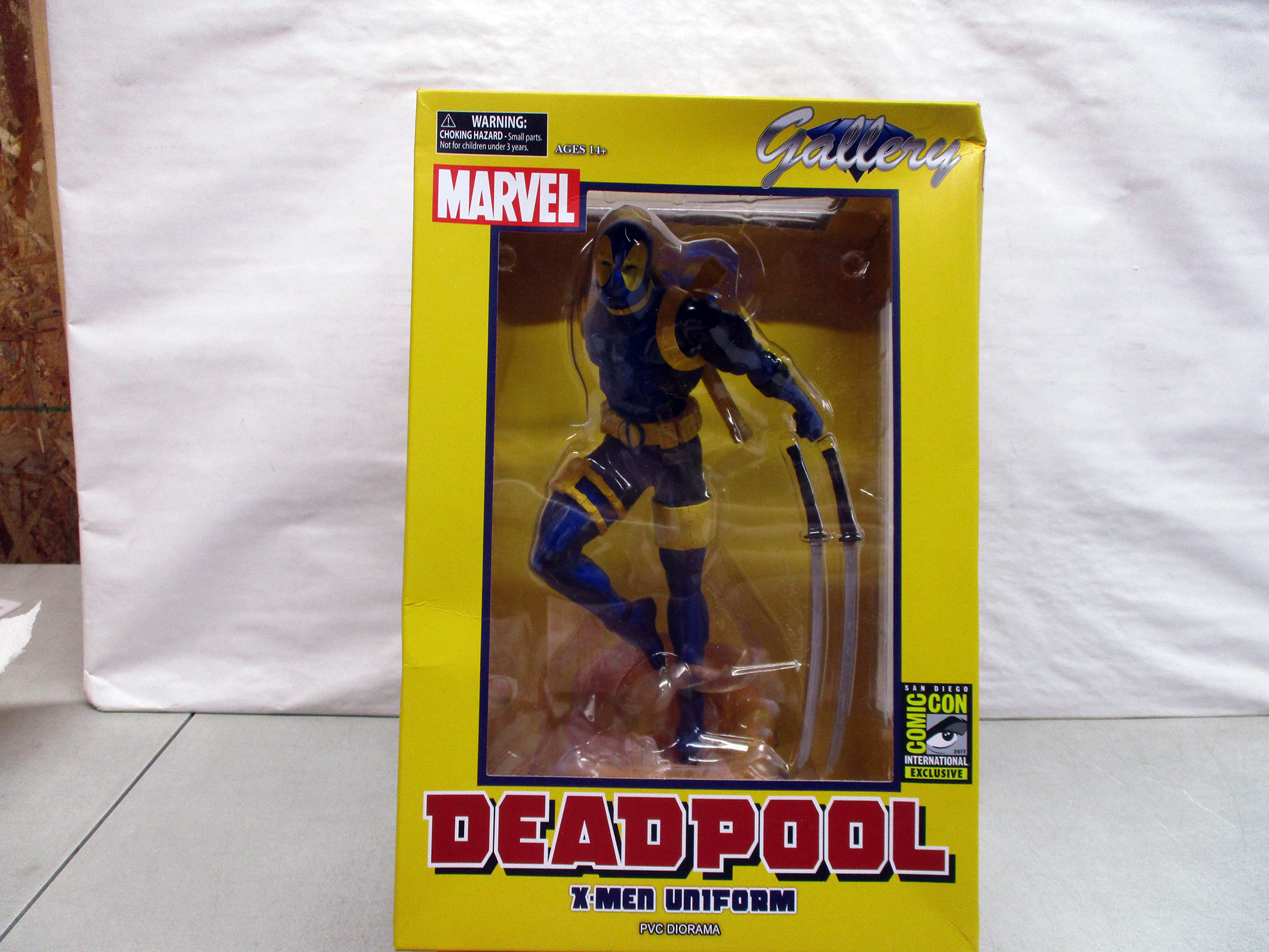 Marvel Gallery series Deadpool figure, featured in his X-Men uniform. Manufactured by Diamond Select Toys. Packaged in a yellow display box designed for San Diego Comic-Con exclusive release. The figure is fully visible and remains in original packaging, which appears unopened and in good condition. (Click image to see high resolution version).