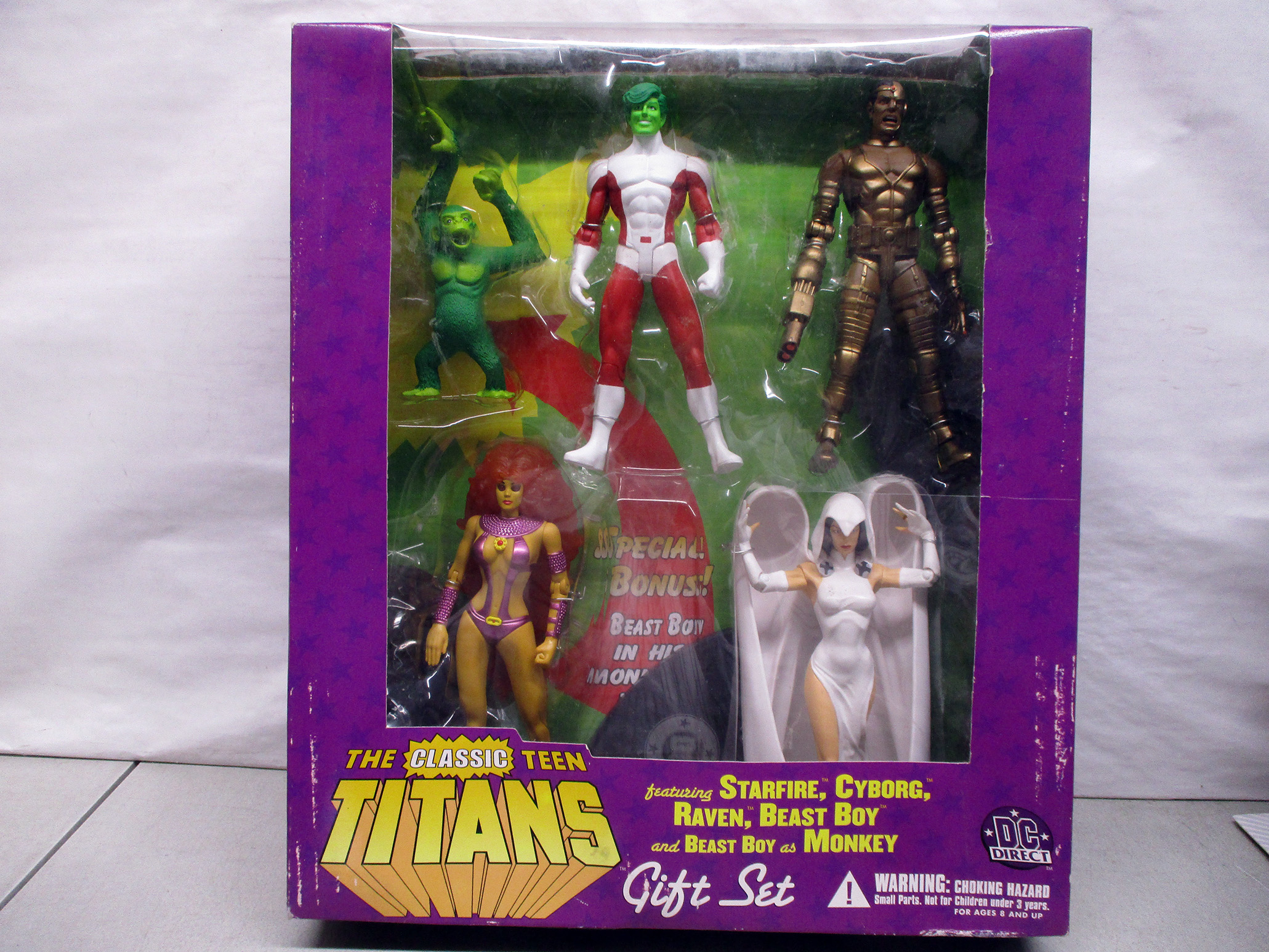 DC Direct Classic Teen Titans Action Figure Gift Set featuring Starfire, Cyborg, Raven, Beast Boy as Beast Boy or Monkey. This set includes five detailed collectible figures in original packaging. The box appears unopened and retains vivid graphics, showcasing a purple backdrop and the Teen Titans logo. Includes bonus Beast Boy figure with an additional monkey form. (Click image to see high resolution version).