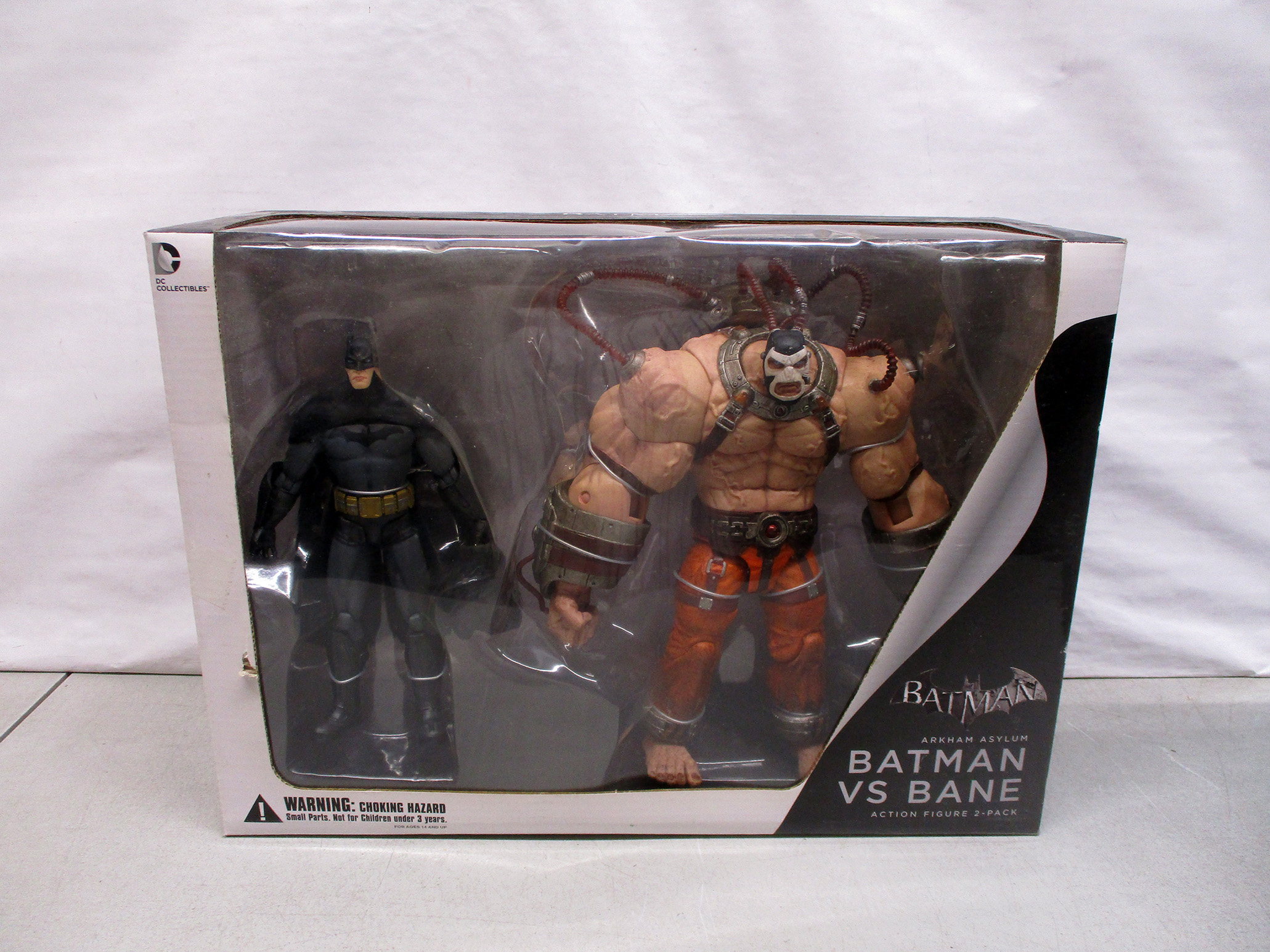 Batman vs Bane action figure set by DC Collectibles designed for the Batman Arkham video game series. Features two detailed figures of Batman and Bane. Comes in original, unopened box with visible wear on the packaging. Figures include intricate detailing and game-accurate designs. Ideal for collectors and fans of the Batman Arkham series. (Click image to see high resolution version).