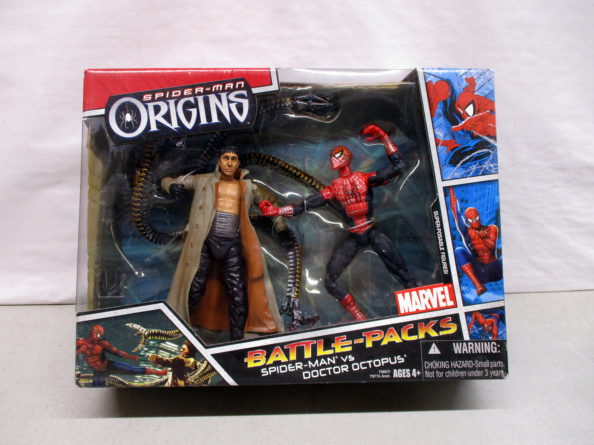 Spider-Man Origins Battle Packs set featuring Spider-Man and Doctor Octopus action figures by Marvel. Includes detailed figures in a window box package with comic-style illustrations and branding. Recommended age 4+. Pack is in unopened and sealed condition, with visible minor wear on packaging. (Click image to see high resolution version).