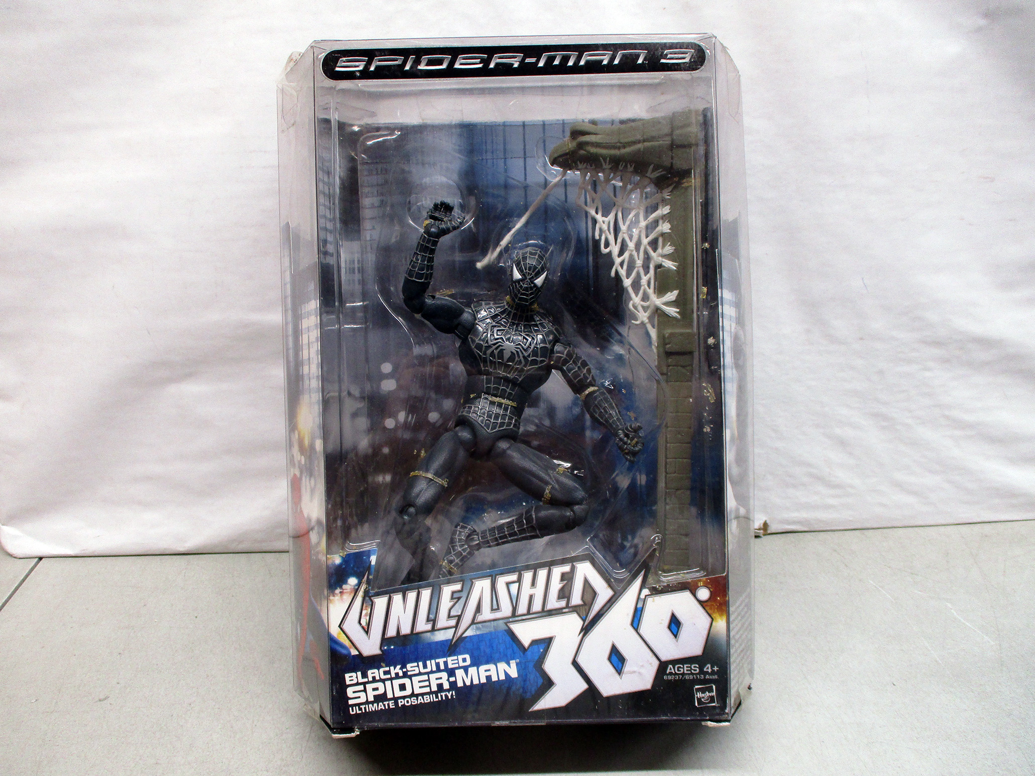 Spider-Man 3 Unleashed 360 Black-Suited Spider-Man action figure. Manufactured by Hasbro, this collectible figure features the iconic black suit and dynamic pose. Packaged in its original sealed box, the figure is suitable for ages 4 and up. Includes detailed accessories and articulated design for display or play. (Click image to see high resolution version).