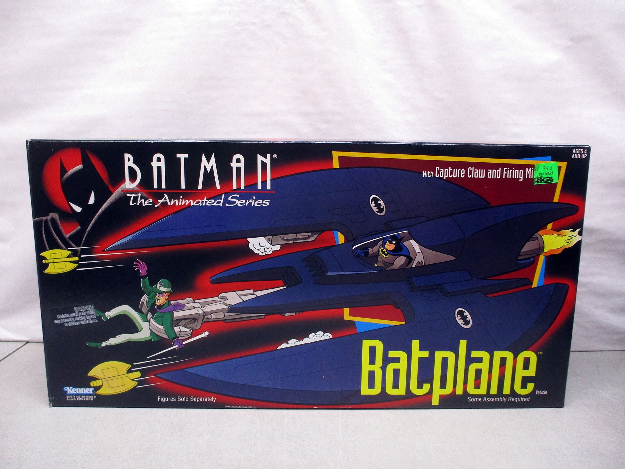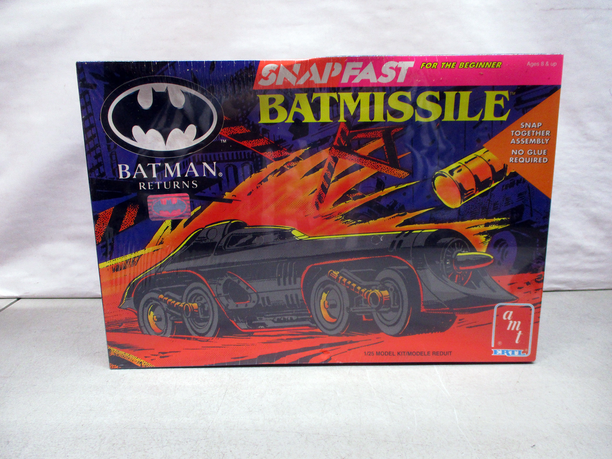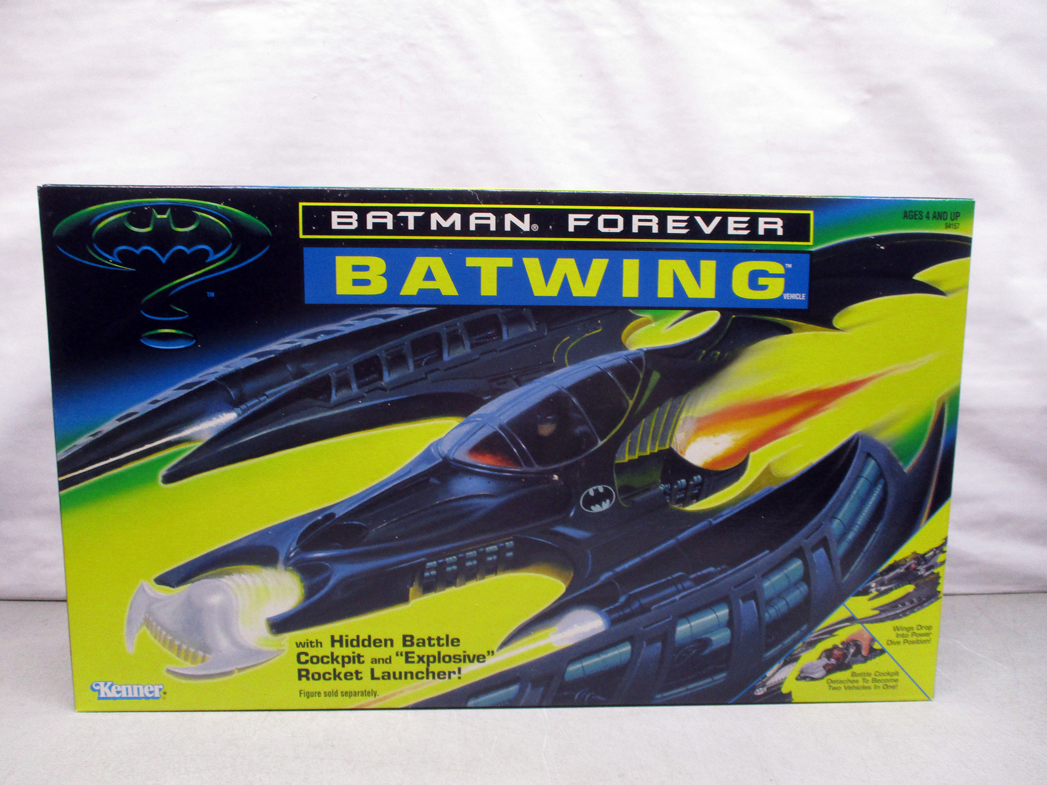 Kenner Batman Batmobile featuring a built-in rocket launcher, packaged in its original box. Includes iconic sleek black design with Batman logo highlights. The box displays vibrant graphics and details about the toy. Overall condition of packaging and contents not specified, but appears intact. (Click image to see high resolution version).