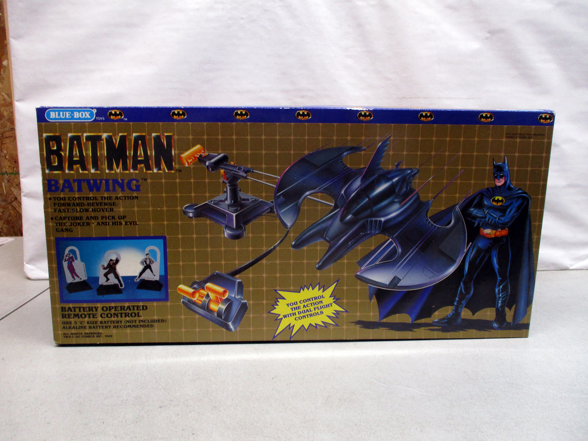 Batman-themed projector gun in its original packaging. Includes 32 projectable images featuring scenes from the Batman universe. The box shows a child holding the projector gun and various sample images from the included slides. The packaging appears intact, with some wear consistent with age. A collectible item for Batman fans. (Click image to see high resolution version).