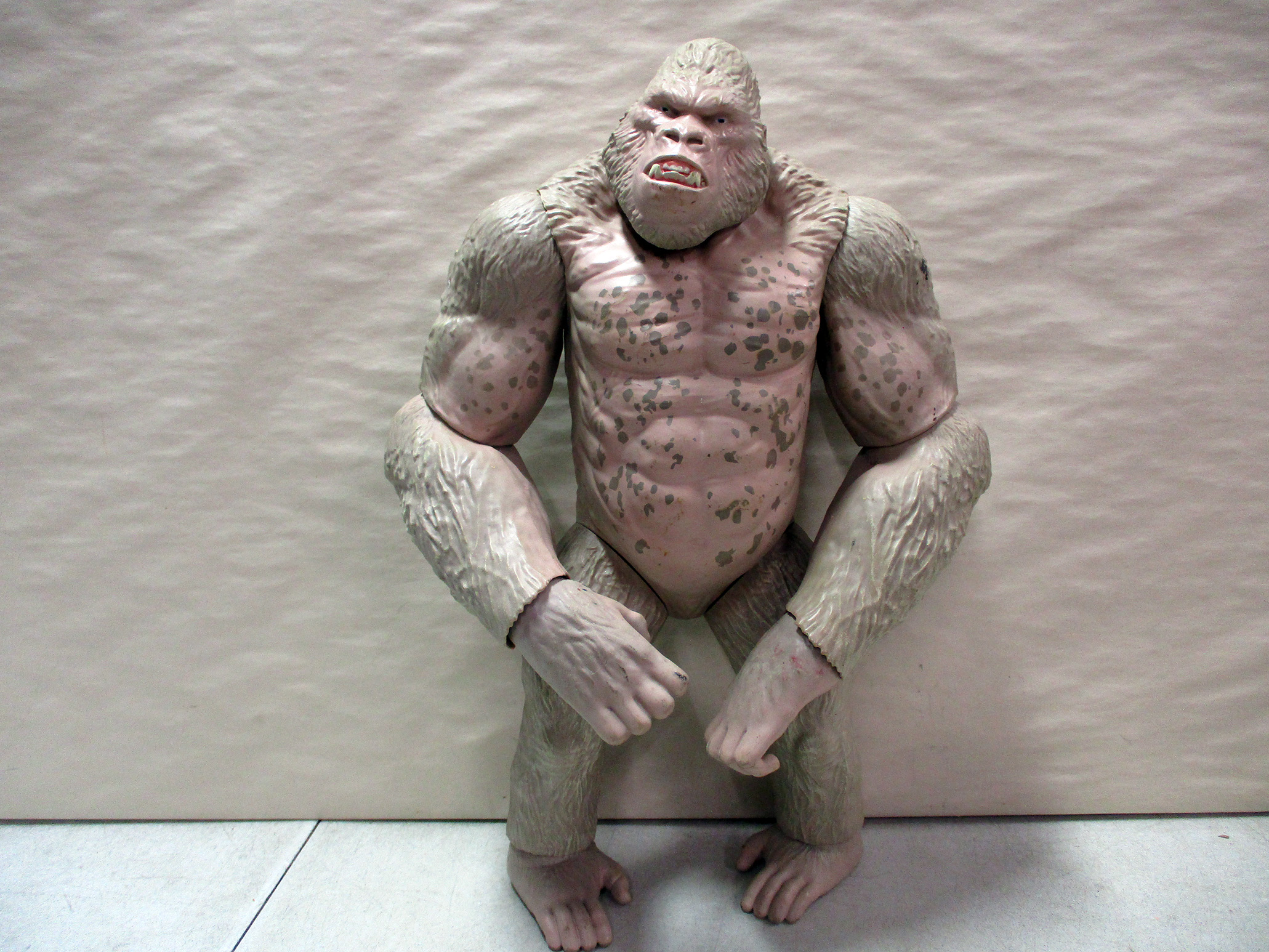 Large poseable gorilla action figure featuring articulated arms, legs, and head. Made from durable plastic with realistic sculpted details, including textured fur and a muscular physique. The figure stands upright and is self-supporting, suited for display or use in play. Gentle wear is visible, indicative of prior usage. (Click image to see high resolution version).