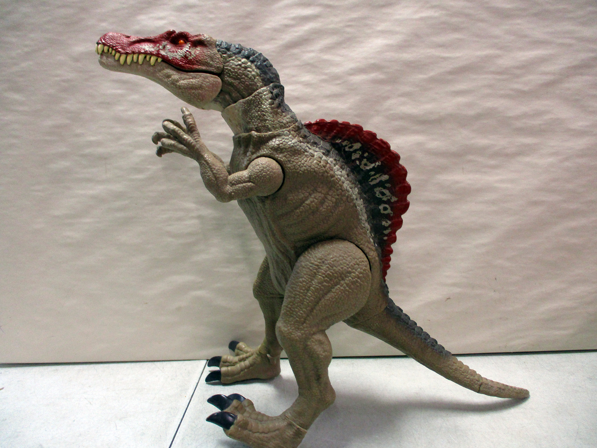 Plastic Spinosaurus action figure featuring a detailed design with realistic coloring. Includes a red spine running along its back. The item showcases articulated joints for enhanced poseability. Condition appears very good with no visible signs of damage or wear. Suitable as a collectible or toy. (Click image to see high resolution version).