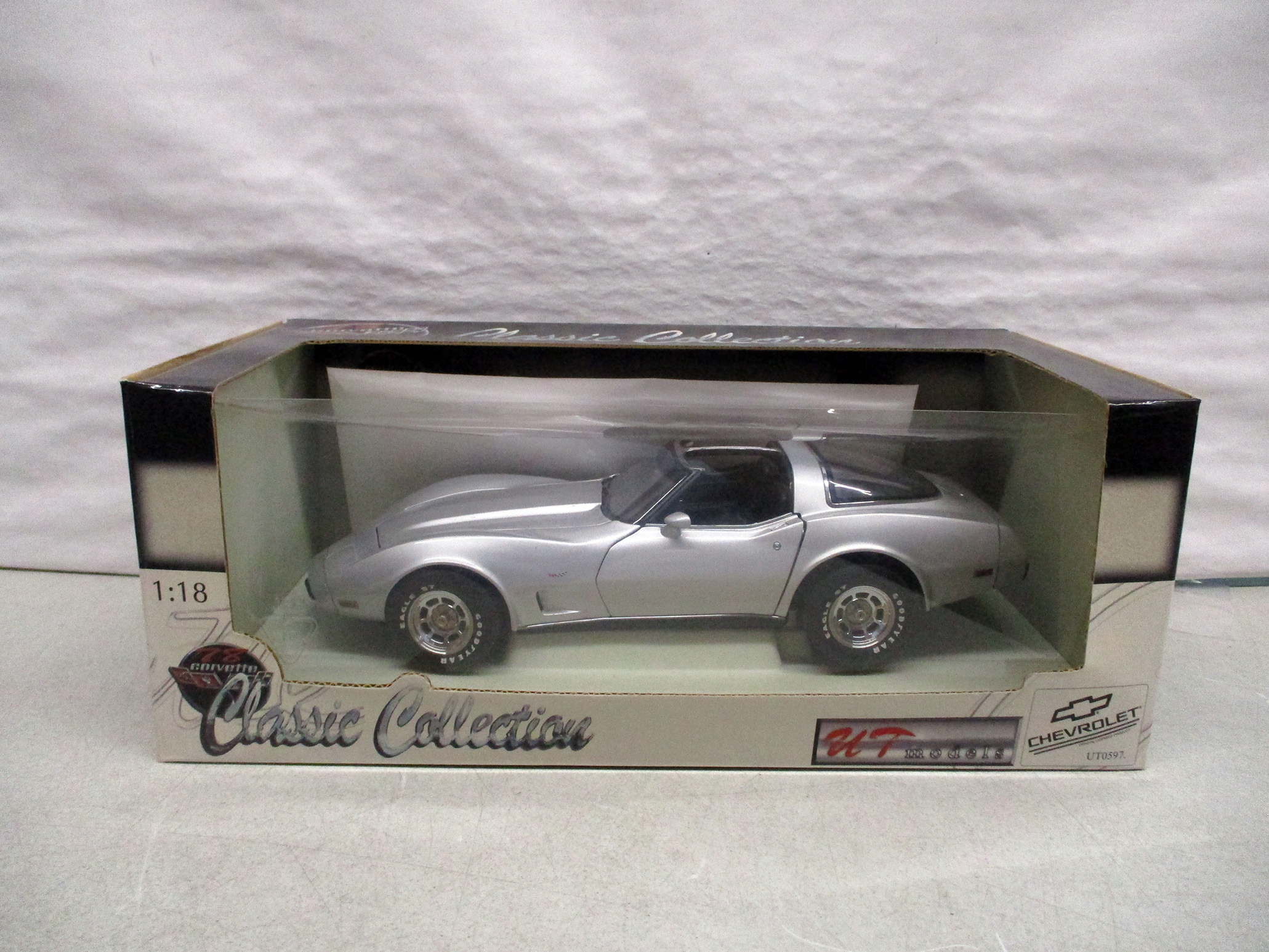 1:18 scale diecast model of a Chevrolet Corvette, part of the Classic Collection series. The model features a silver exterior, realistic detailing, and is presented in its original display box, which remains sealed. Manufactured by RC2 Corporation under the Route 66 license. The condition of the box and car appears preserved for collectible purposes. (Click image to see high resolution version).