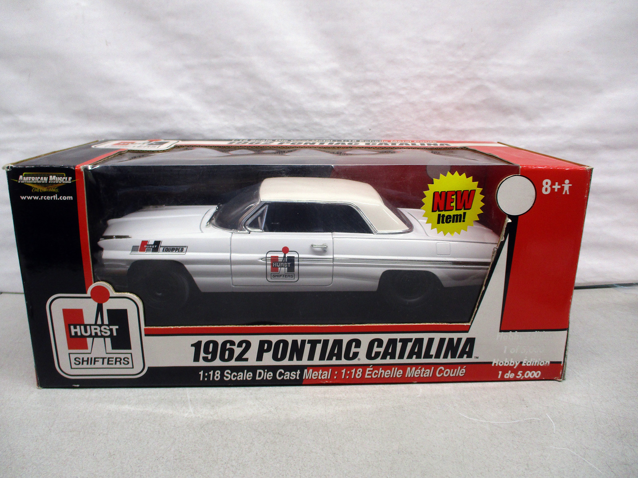 1:18 scale diecast model of a 1962 Pontiac Catalina, manufactured by American Muscle. Features detailed craftsmanship and faithful reproduction of the vehicle, marked with Hurst Shifters branding. Comes in original packaging with a clear display window. Includes collectible details and is marked as suitable for ages 8 and up. (Click image to see high resolution version).