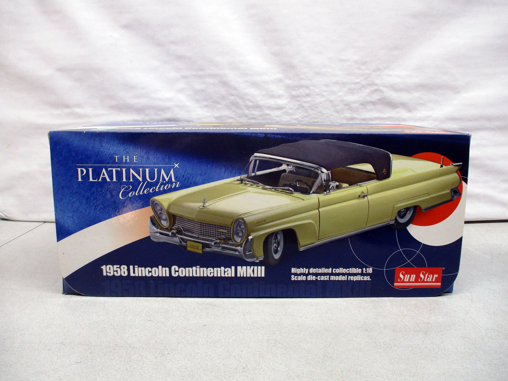 Sun Star Platinum Collection 1:18 scale diecast model of the 1958 Lincoln Continental Mk III. Features detailed interior and exterior. The model is in its original packaging, showcasing the manufacturer's branding and design. The diecast construction highlights the vintage car's classic style and details. (Click image to see high resolution version).