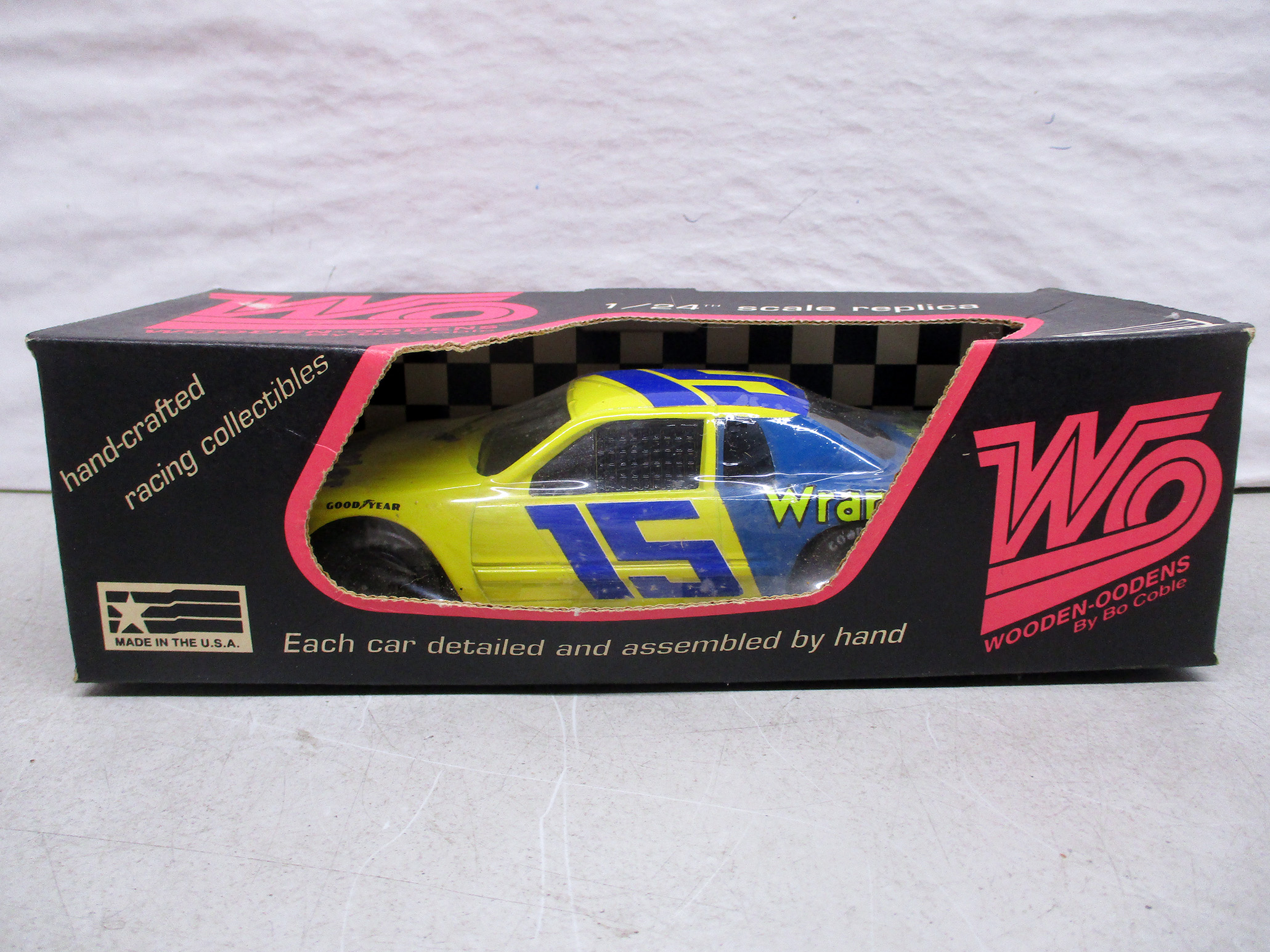 Wooden Woodies hand-crafted racing collectible featuring a die-cast car with yellow and blue color scheme, marked with the number 15. The packaging includes branding and details about the craftsmanship, and the box remains intact. A suitable collectible for racing enthusiasts. (Click image to see high resolution version).