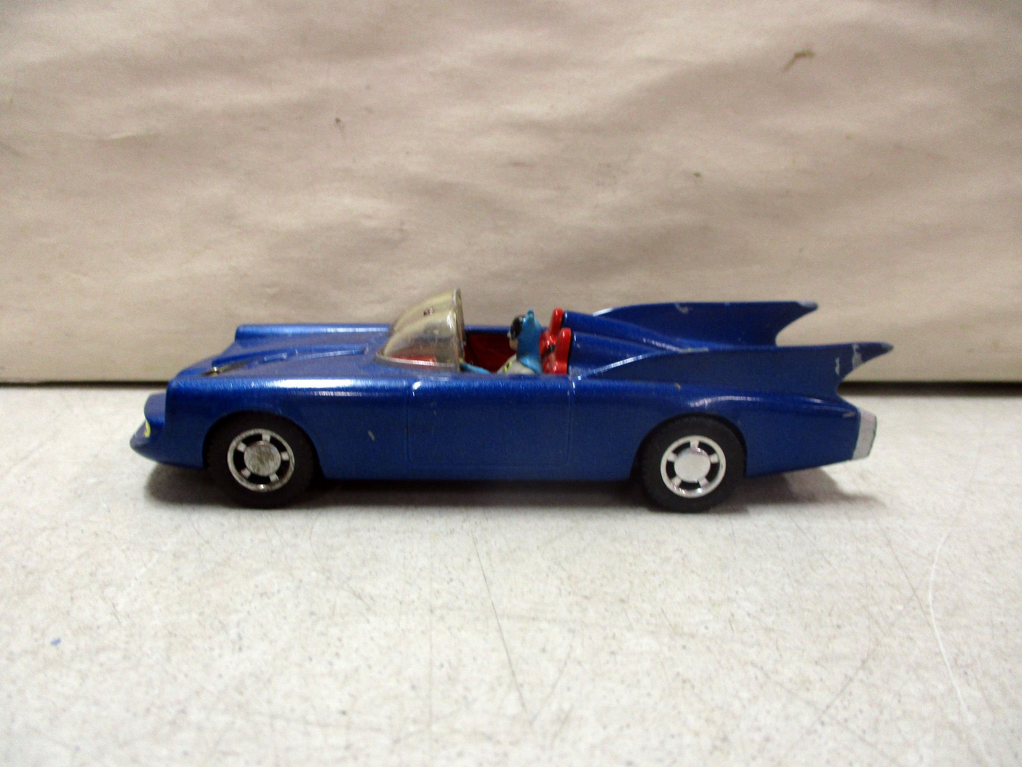 This is a model of the 1960's Comic Book Batmobile, featuring a black finish and detailed craftsmanship. Originating from the USA, it is made primarily of die-cast metal and plastic. The model depicts characters from the comic seated inside the vehicle. (Click image to see high resolution version).