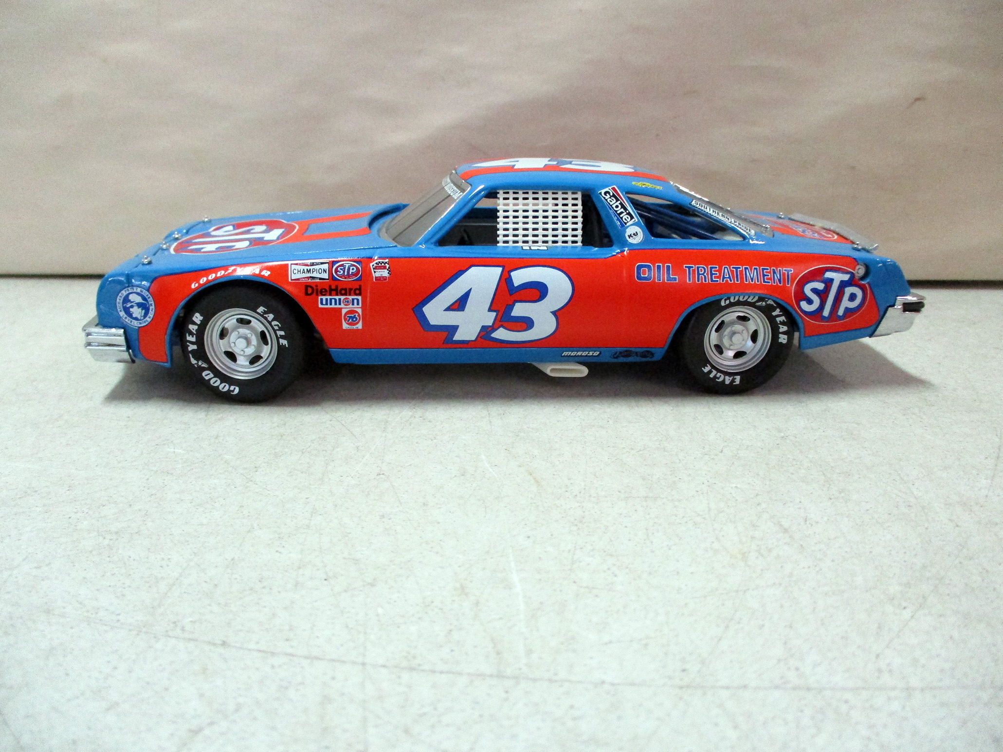 Franklin Mint Richad Petty STP Oldsmobile. Die-cast model of the iconic No. 43 race car, adorned with red and blue STP Oil Treatment livery. Features detailed sponsor logos, white-letter tires, and realistic interior details. Likely representative of a vehicle from stock car racing history. Measures approximately 1:24 scale. Condition appears used or displayed but well-maintained, with visible detail and color vibrancy. (Click image to see high resolution version).
