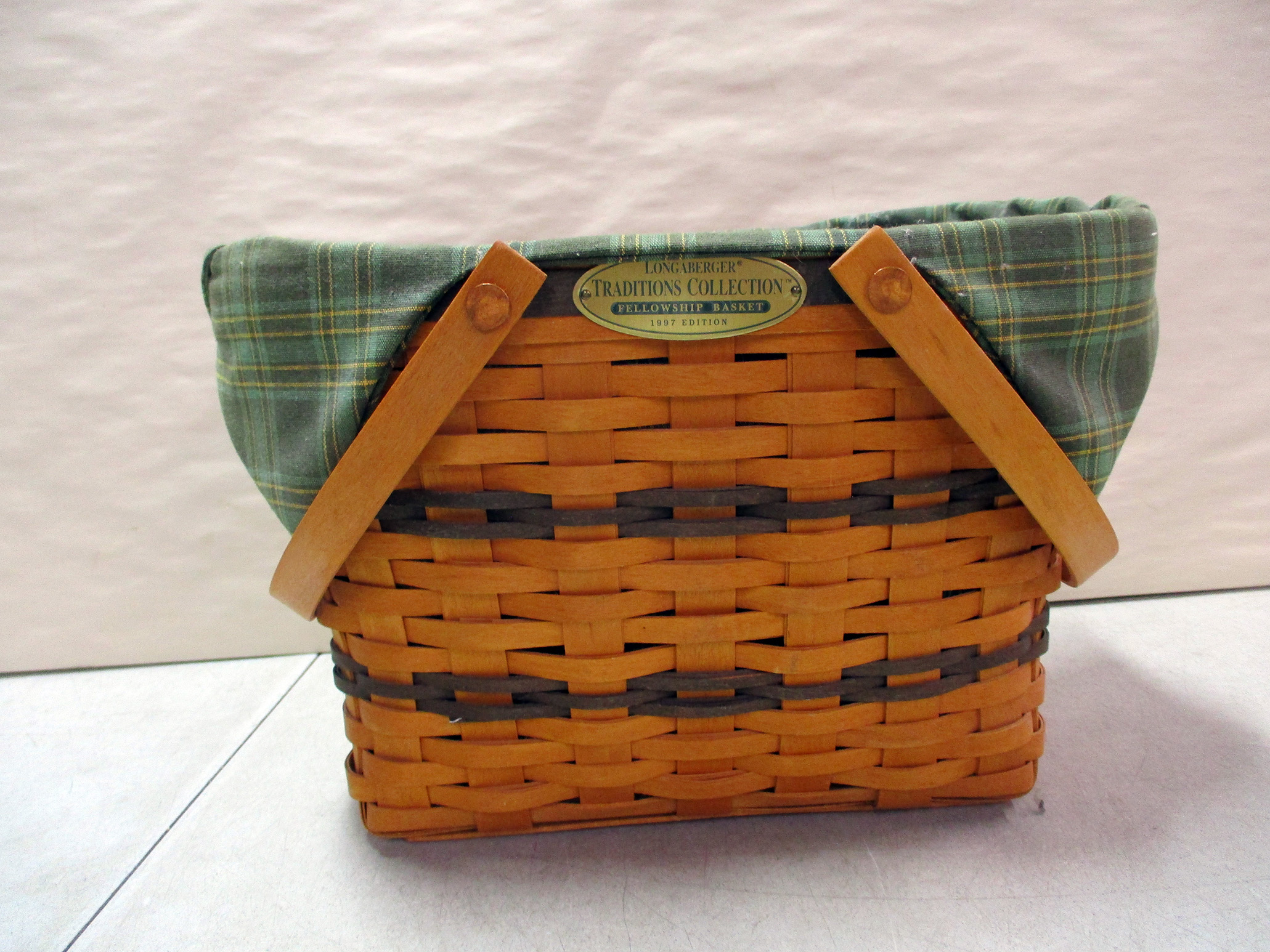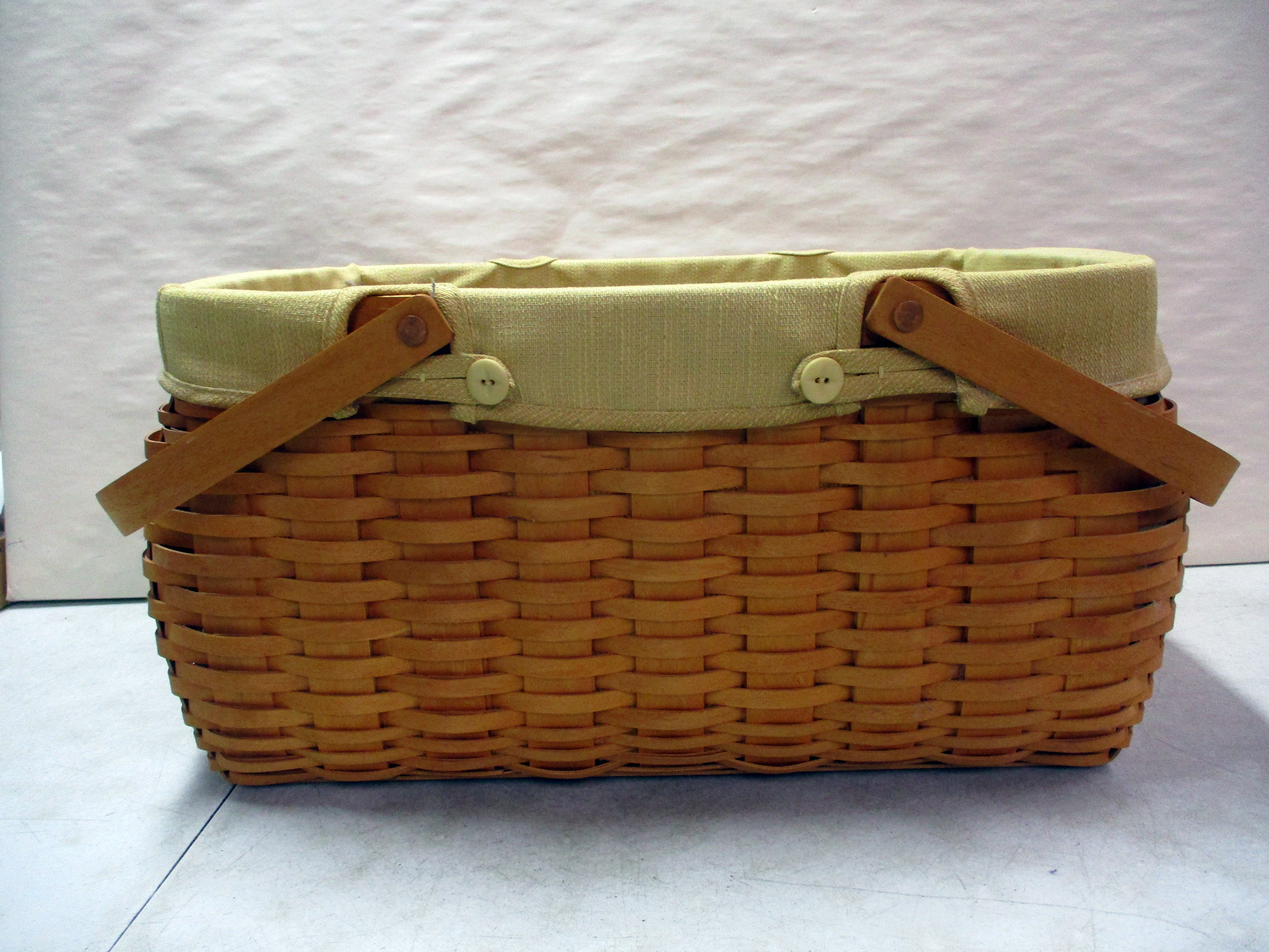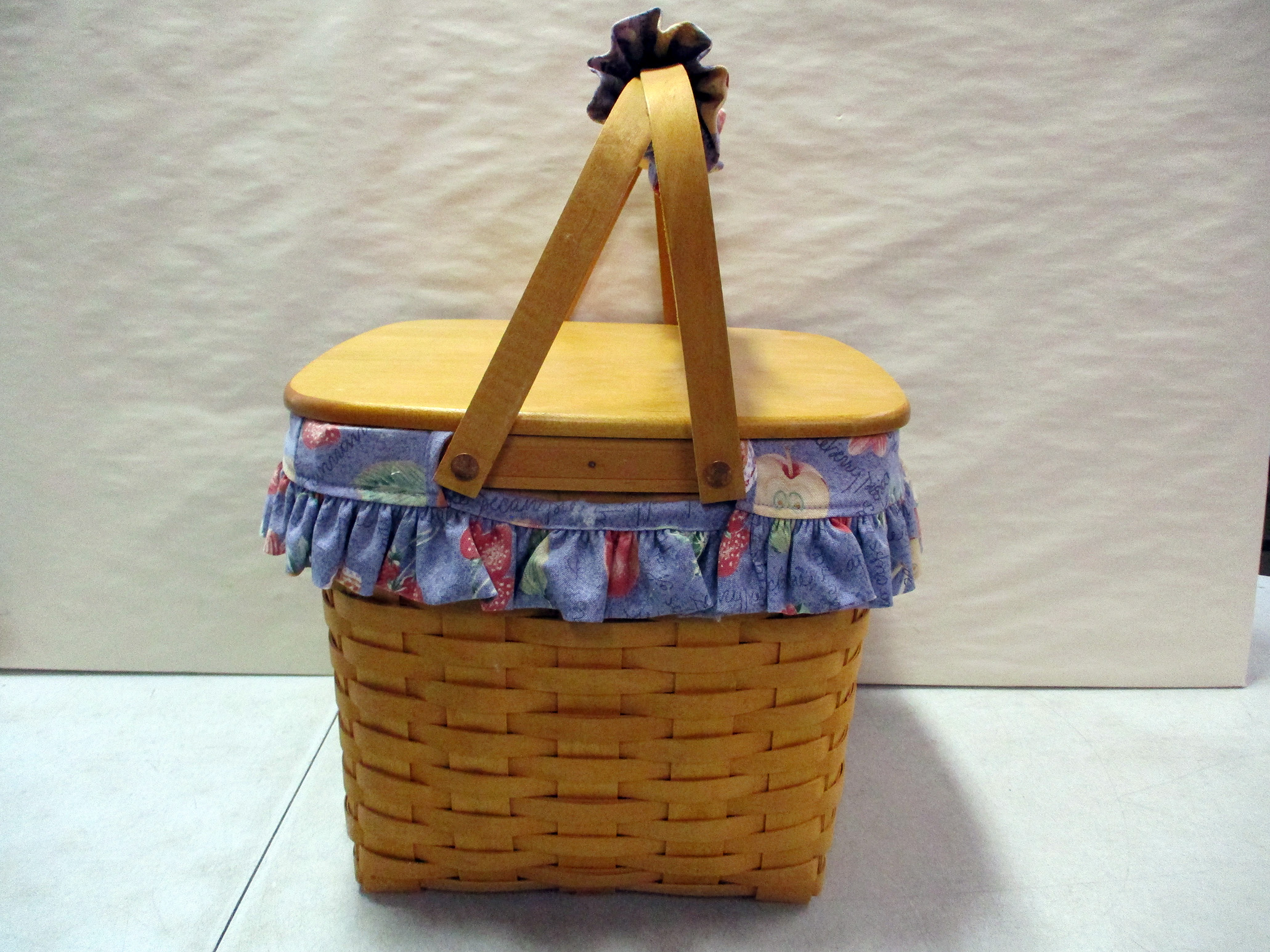 This is a Japanese wicker basket featuring four frosted glass tumblers. The glasses are decorated with colorful bird and floral designs. The basket, made from natural wicker, holds a ceramic or porcelain plate depicting an avian scene. The item appears to date back to the mid-20th century. No maker's mark is visible. (Click image to see high resolution version).