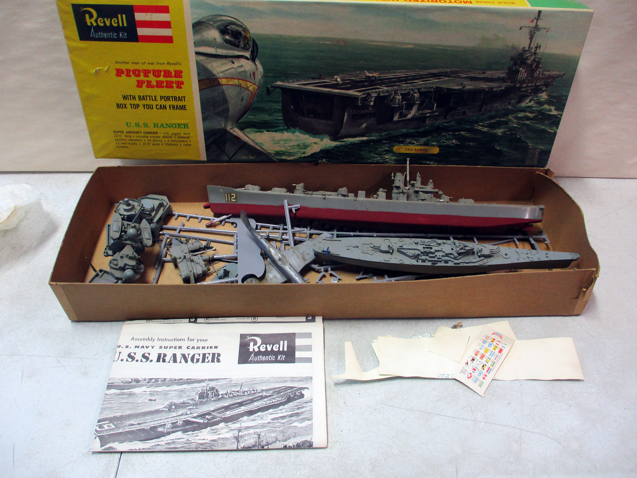Revell USS Ranger model kit in original box, featuring detailed components for assembly. Includes assembly instructions, unassembled parts, and accompanying decals. The box displays artwork of the USS Ranger and is in fair condition. Some parts may be loose; condition of components to be verified. (Click image to see high resolution version).