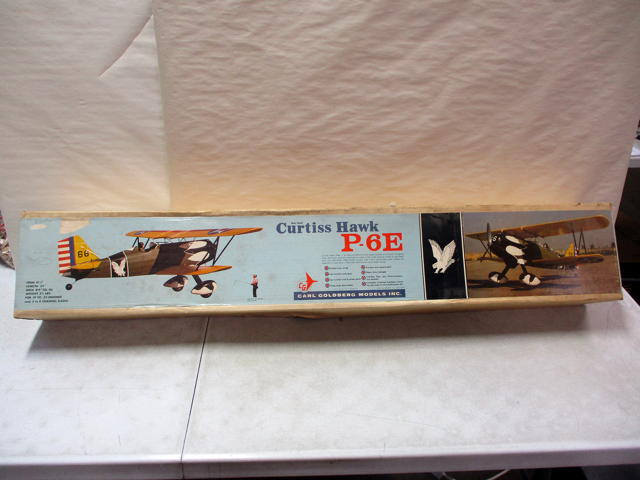 Vintage model airplane kit of the Curtiss Hawk P-6E by Guillows. Includes wooden parts, instructions, and original box featuring detailed illustrations. Suitable for building a balsa wood model of the iconic aircraft. Condition of contents is unspecified, but the box shows signs of wear indicative of its age. (Click image to see high resolution version).