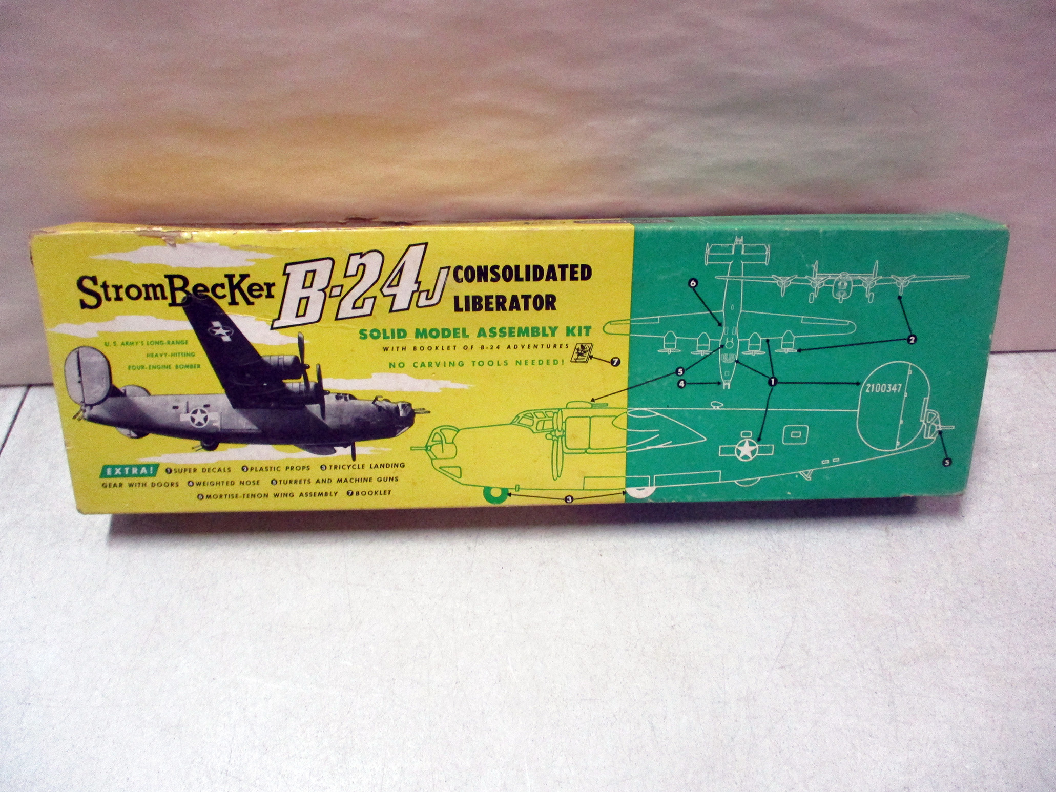 Strombecker model kit for the B-24J Consolidated Liberator. This solid model assembly kit is housed in its original box, featuring images and diagrams of the aircraft. The packaging is illustrated with assembly instructions and offers insight into mid-20th century model-making design. Condition of the box and contents is unknown. (Click image to see high resolution version).