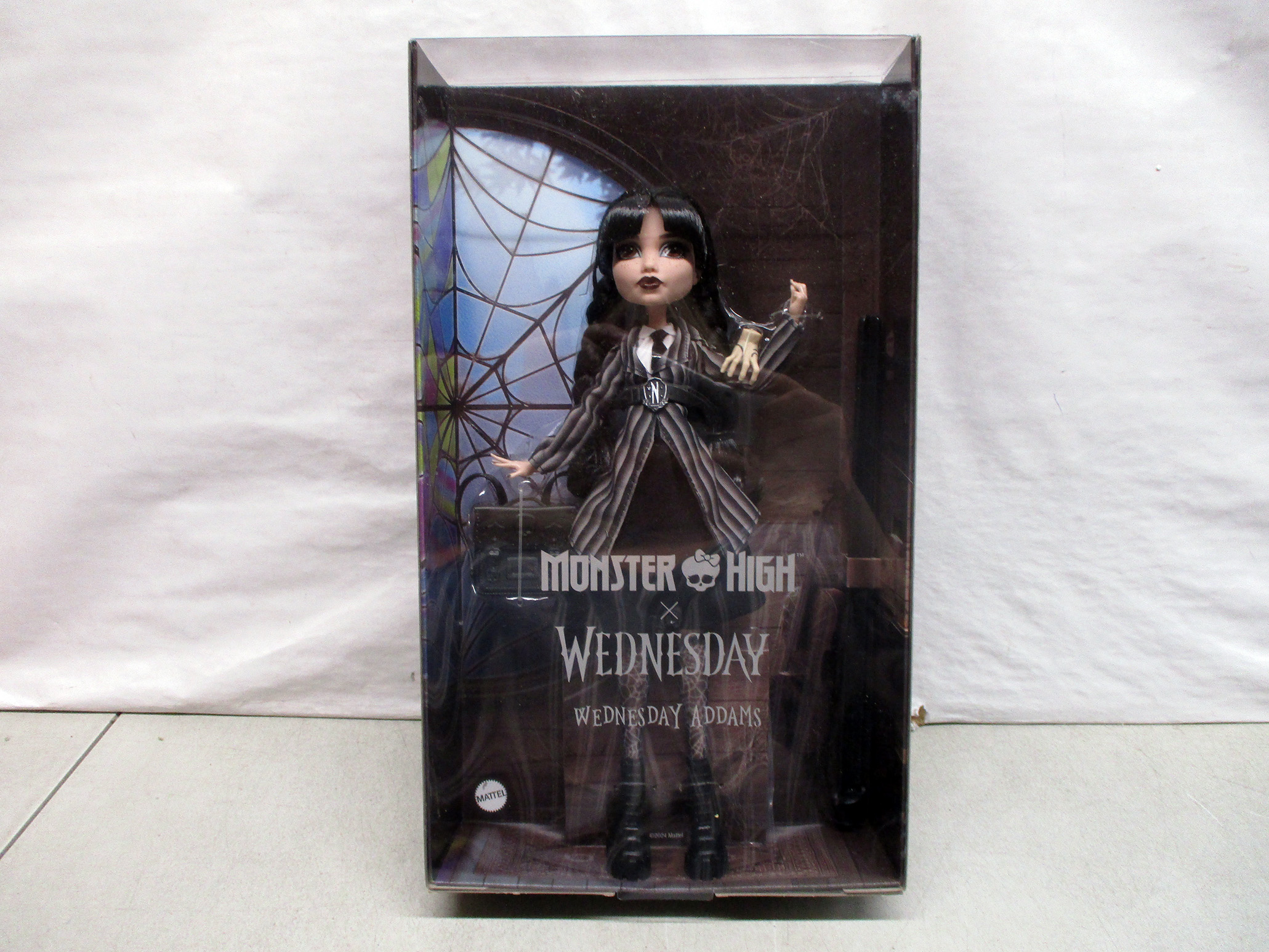 Monster High Wednesday Addams doll in its original unopened packaging. The doll features Wednesday in her iconic black and white striped outfit, complete with accessories. The box displays branding and artwork, including the spiderweb background. Box and doll appear to be in good condition, suitable for both collectors and fans. (Click image to see high resolution version).