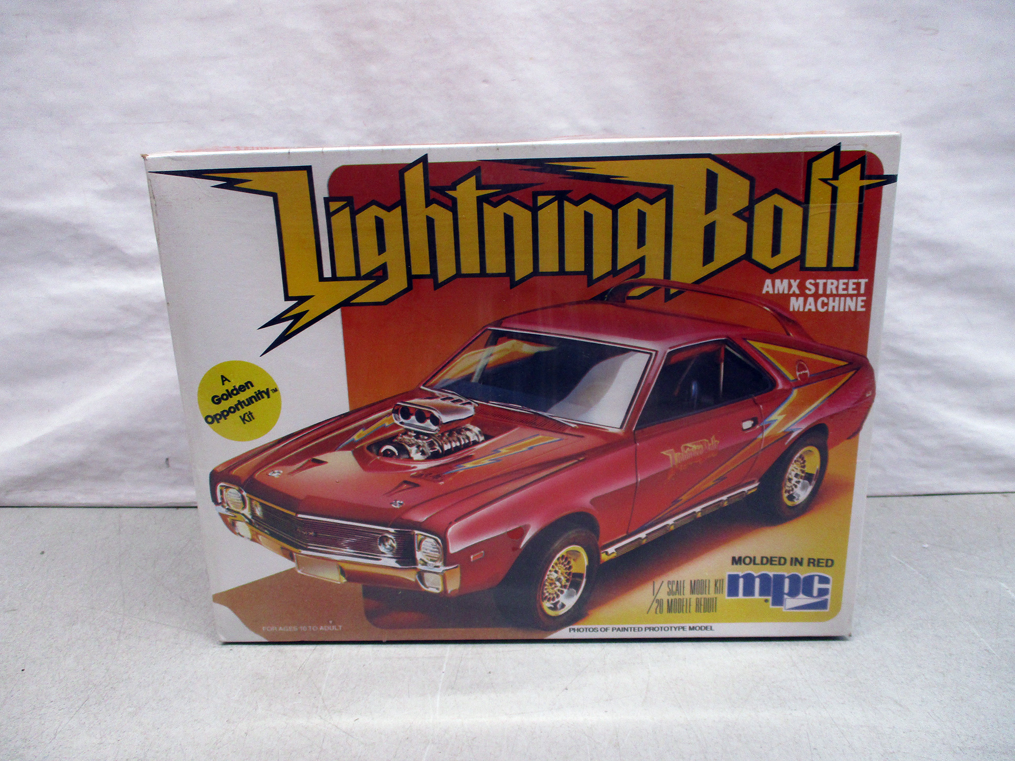 MPC Lightning Bolt AMX Street Machine model kit in original packaging. The kit includes detailed parts to assemble a scale replica of the AMX street machine car, molded in red plastic. Packaging is in good condition with visible graphics, and it includes instructions for assembly. Condition of internal components is presumed complete but not verified. (Click image to see high resolution version).