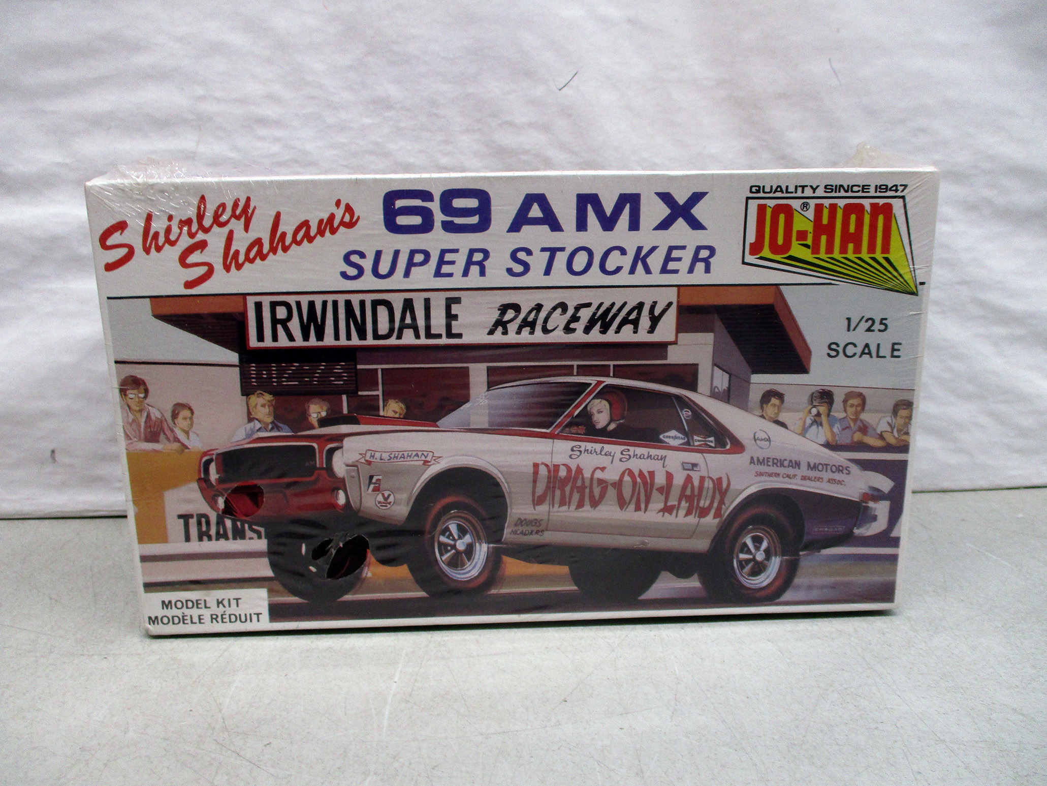 Jo-Han 1/25 scale model kit featuring Shirley Shahan's '69 AMX Super Stocker. Includes original packaging with detailed art of the "Drag-On-Lady" racing at Irwindale Raceway. Packaging is sealed, and contents appear unused. Suitable for collectors or hobbyists interested in vintage drag racing memorabilia. (Click image to see high resolution version).