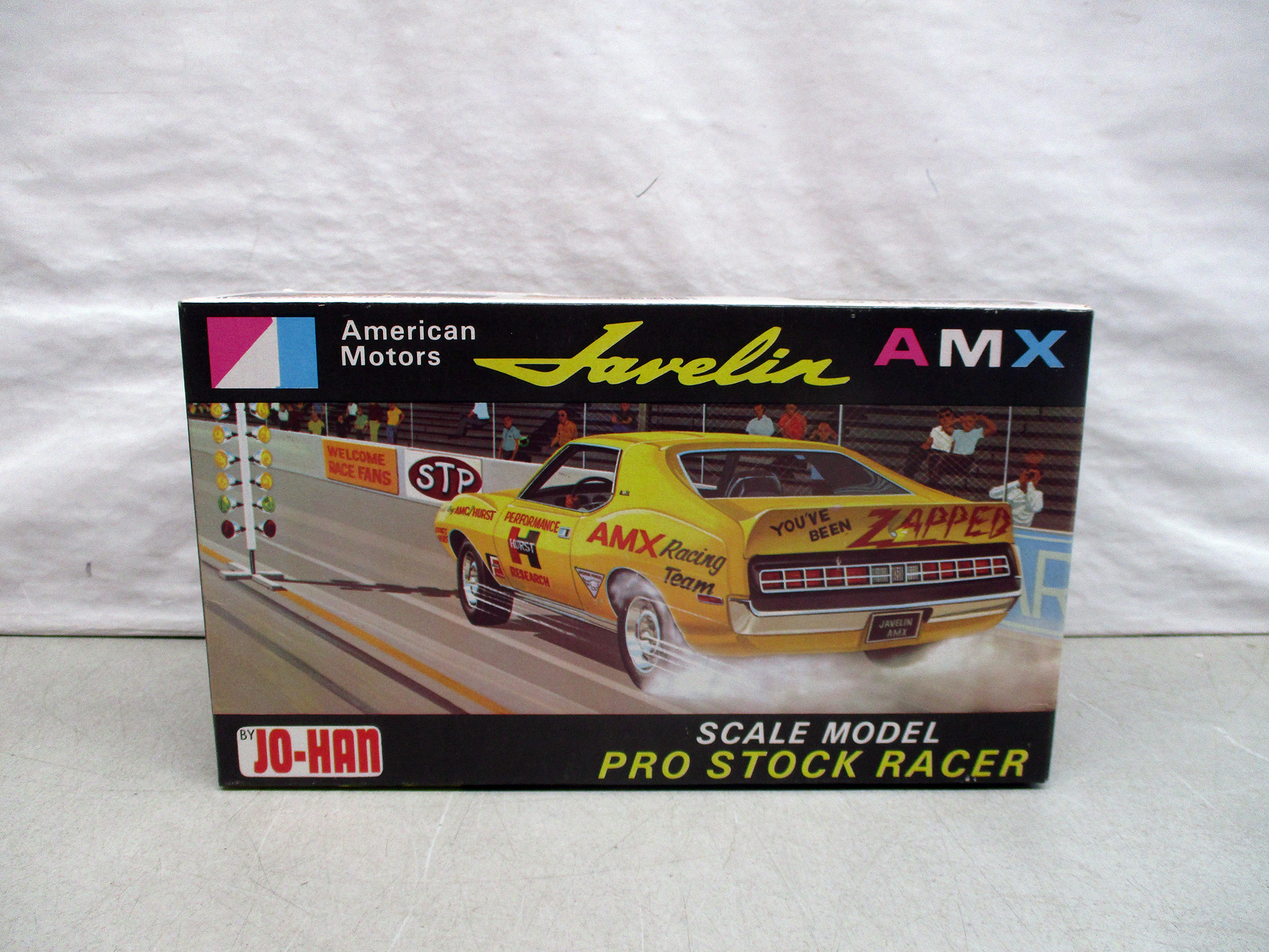 Jo-Han scale model kit for a Pro Stock Racer featuring the American Motors Javelin AMX. Includes vibrant box art with a racing scene. Originally produced by Jo-Han, the kit features parts for assembling a replica of the Javelin AMX. The box appears intact, and it does not indicate if the contents are complete or assembled. (Click image to see high resolution version).