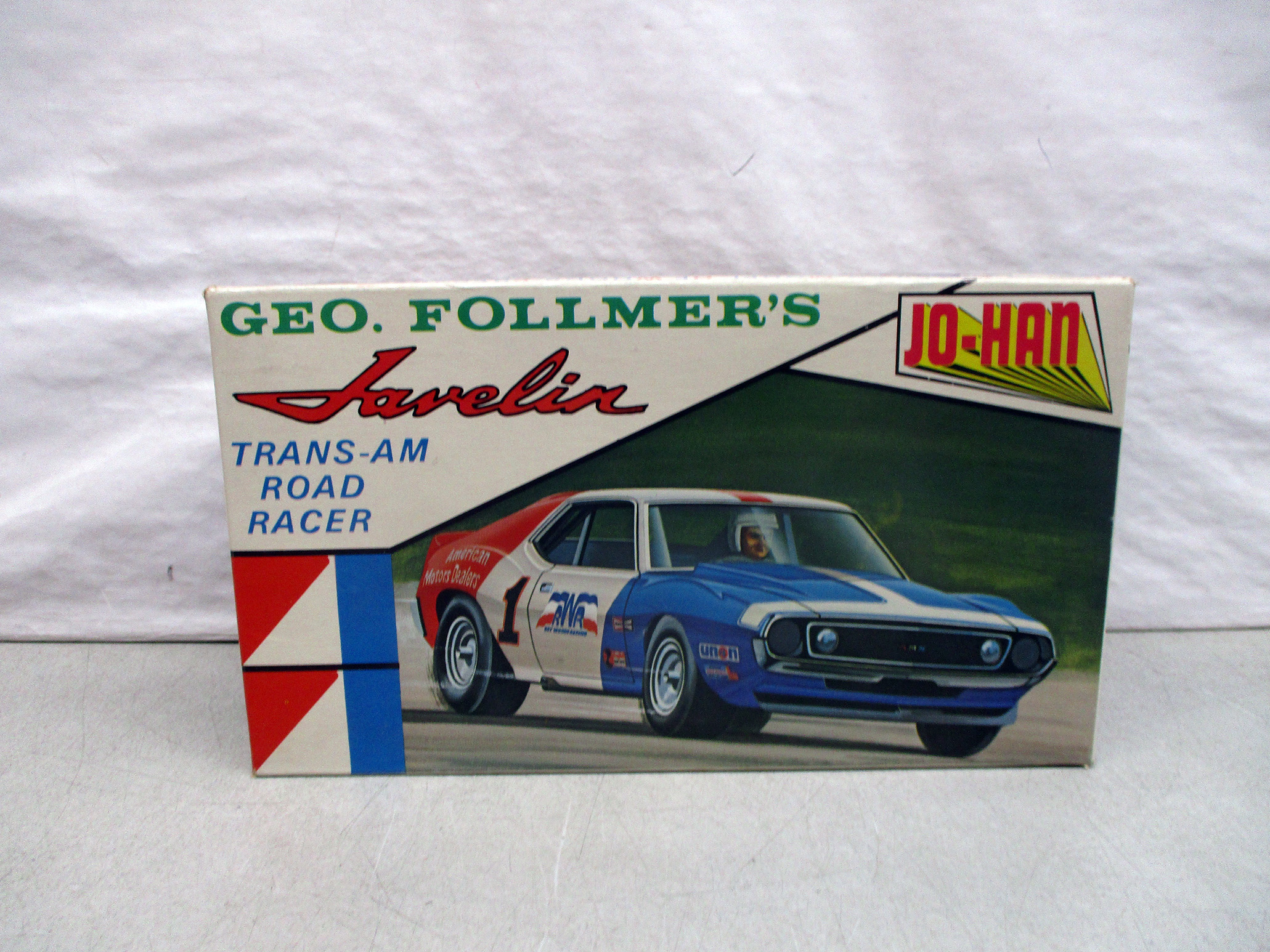 Unassembled Jo-Han scale model kit of Geo. Follmer's Javelin Trans-Am Road Racer. The kit appears to feature detailed parts for the vehicle, original packaging, and vintage artwork. The condition of the box seems intact, with bright graphics. Contents condition and completion not verified. (Click image to see high resolution version).