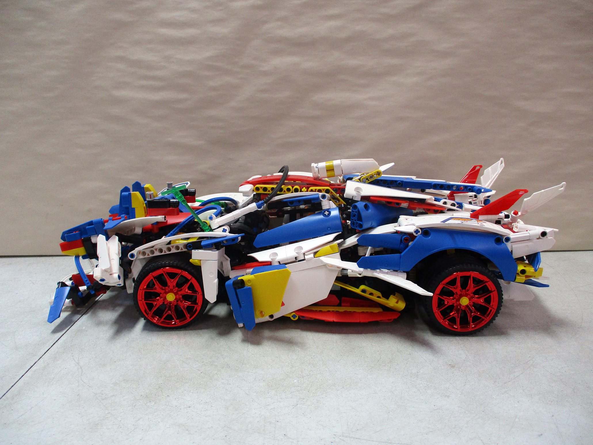 Custom-built model car created from Technic-style interlocking building blocks in multicolored elements. Features intricate details, including red wheels, aerodynamic body parts, and functional embellishments. Suitable as a collectible or display piece. Dimensions and specific set details are not provided. (Click image to see high resolution version).