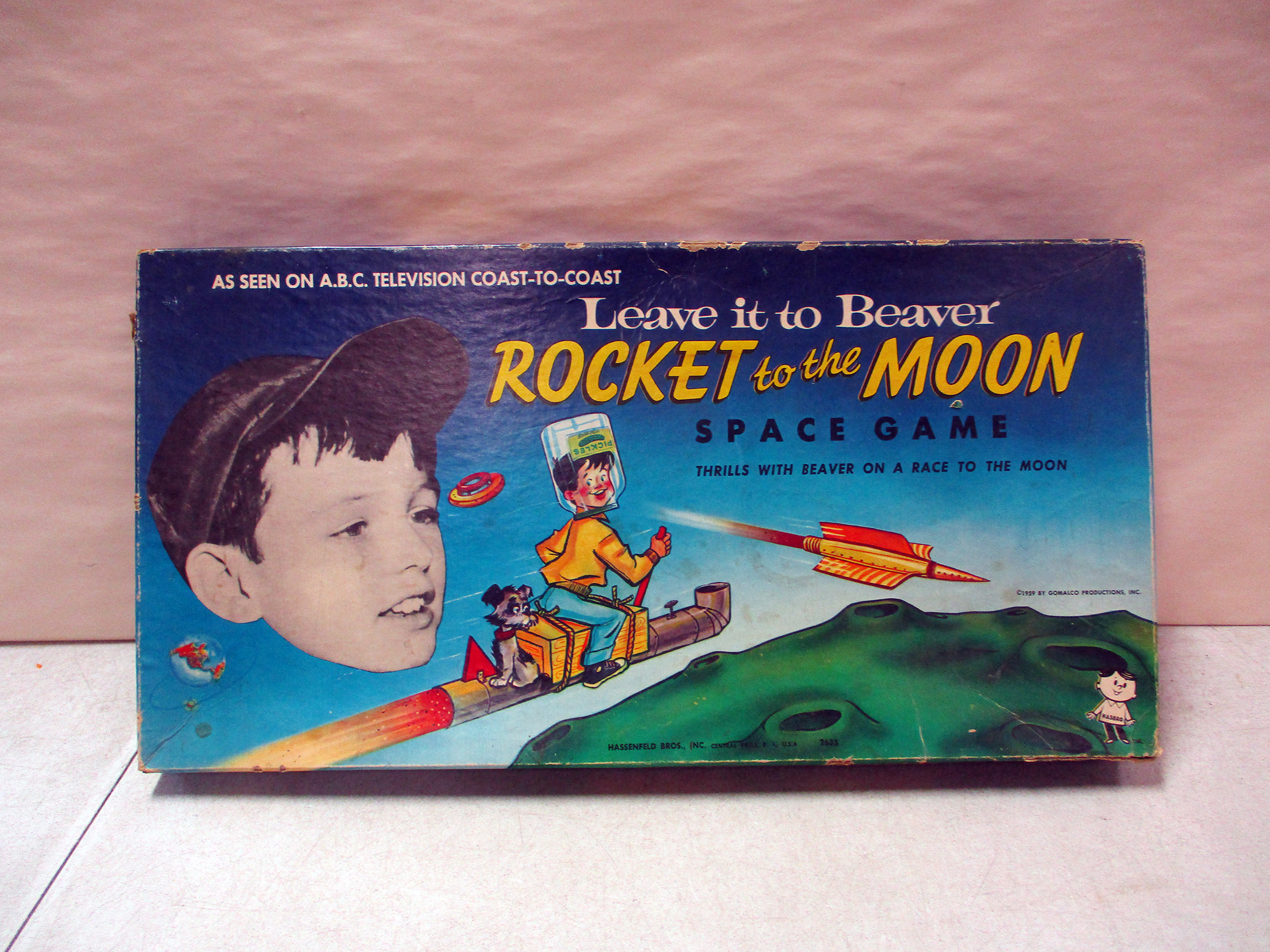 Leave It to Beaver Rocket to the Moon Space Game, themed after the popular ABC television show. Manufactured in the mid-20th century, the box features colorful illustrations inspired by the show and space exploration. Includes game components likely original to the set. Condition of box shows signs of age and wear, with no further details on completeness of the contents. (Click image to see high resolution version).