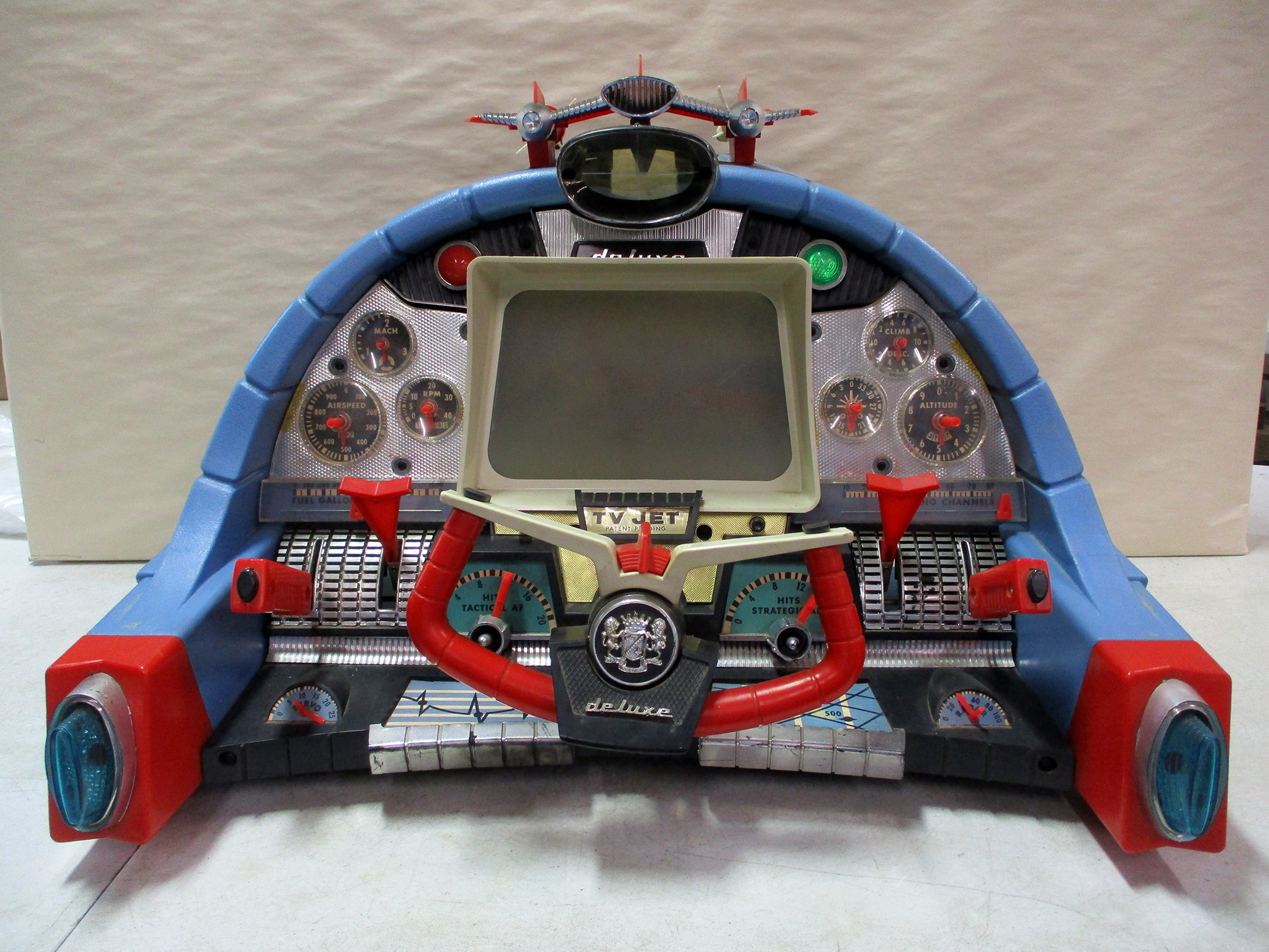 1960's Deluxe Reading Jimmy Jet flight simulator a mechanical toy designed to replicate a futuristic spaceship console. Features include a control panel with levers, dials, and a central screen. Made of plastic with red, blue, and silver coloring. Some signs of age and potential wear present. Size and exact functionality unknown; likely intended as a children's toy from the mid-20th century. (Click image to see high resolution version).