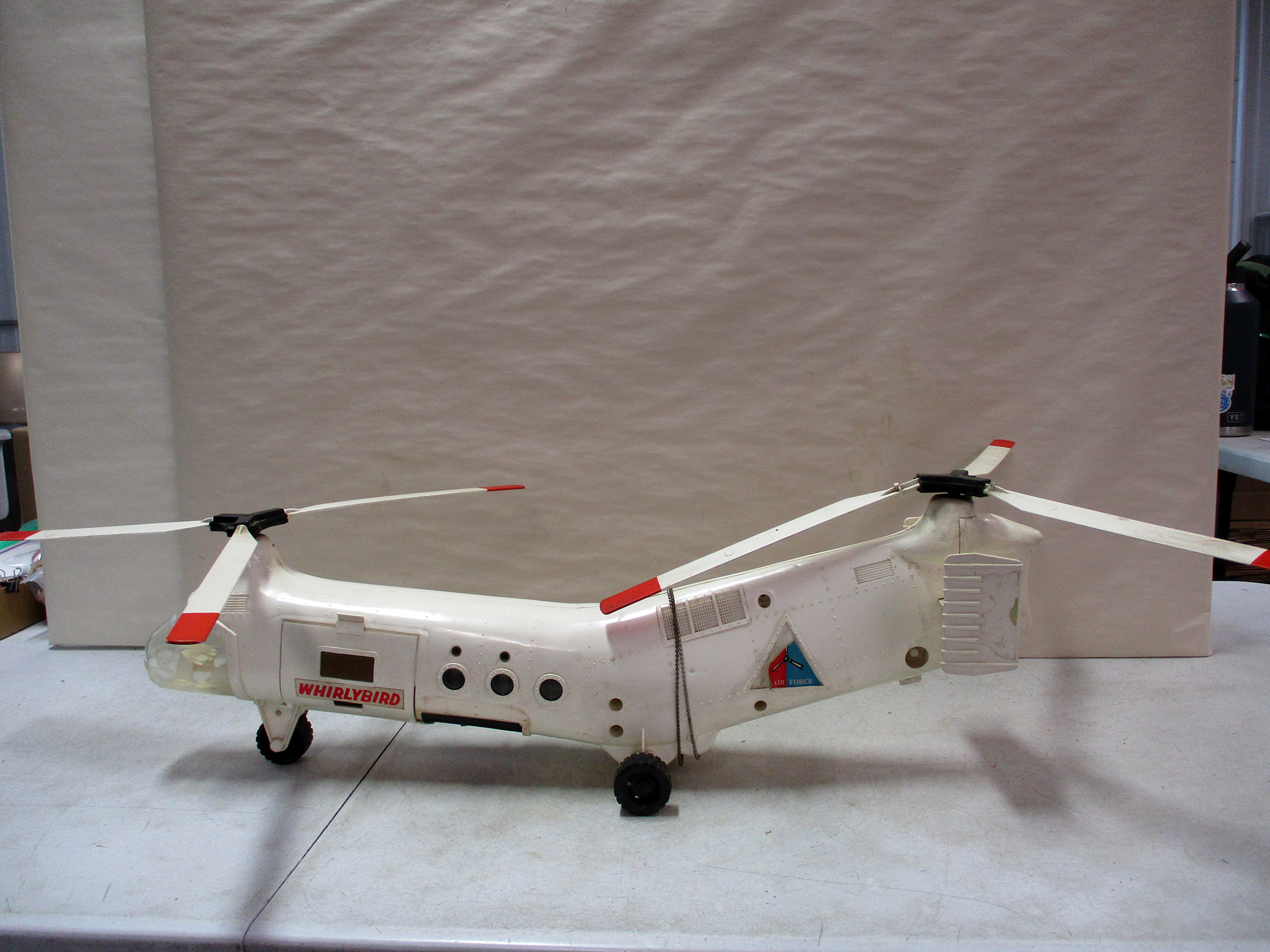 White plastic toy helicopter featuring dual rotors and red detailing on the rotor blades. The body has decals, including 'Whirlybird.' Equipped with wheels for mobility, with the tail rotor section and landing gear visible. Overall condition shows signs of prior use and age, with some wear on decals and body. (Click image to see high resolution version).