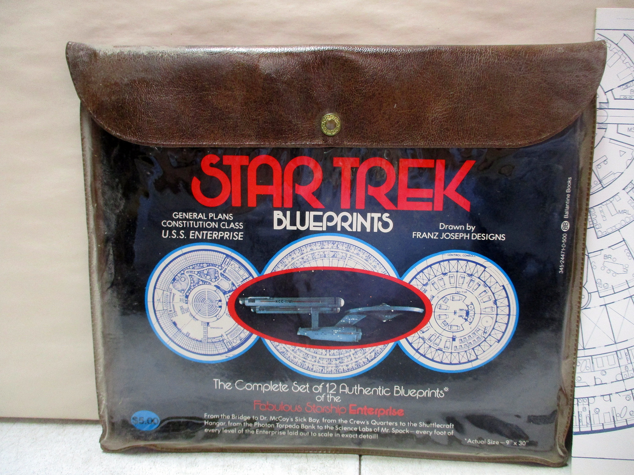 Star Trek Blueprints set featuring 12 authentic blueprints of the U.S.S. Enterprise, Constitution Class. Designed by Franz Joseph Designs. Blueprints are enclosed in the original brown leather-like case, showcasing secure closure. Ideal collectible for enthusiasts and franchise fans. Condition appears intact with possible signs of age-related wear on the case. (Click image to see high resolution version).