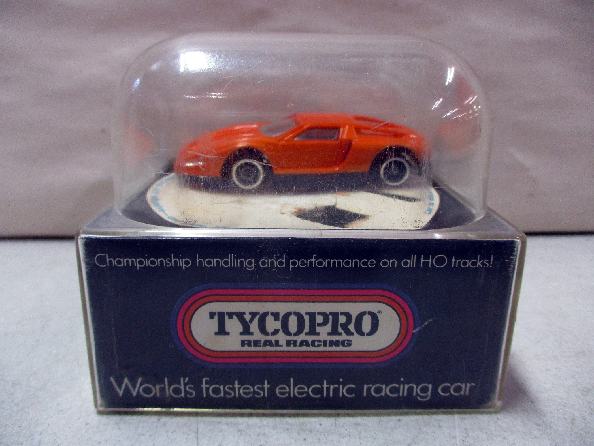 TycoPro HO scale electric racing car in its original packaging. The model is a bright orange sports car with a detailed design. Packaging includes a clear plastic cover and branded base, displaying the slogan "World's fastest electric racing car." Box shows minor wear but retains all original branding and information. (Click image to see high resolution version).