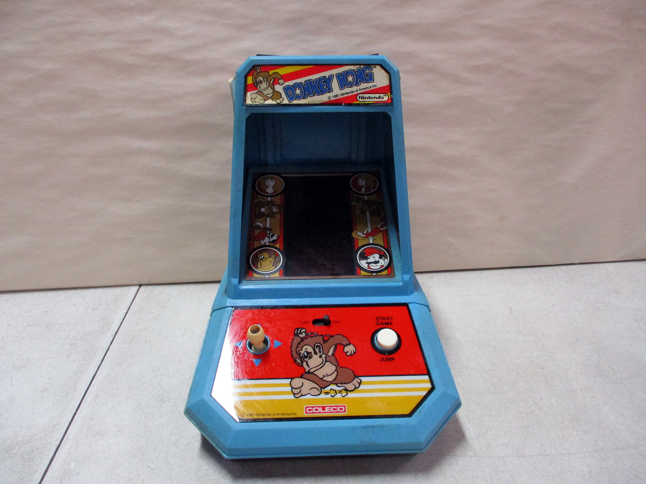 A vintage Coleco tabletop Donkey Kong mini arcade game from the 1980s. This electronic handheld arcade features a vibrant blue casing with colorful artwork depicting characters and branding from the Donkey Kong franchise. Battery-operated, with joystick and button controls. Overall condition and functionality are unverified. (Click image to see high resolution version).