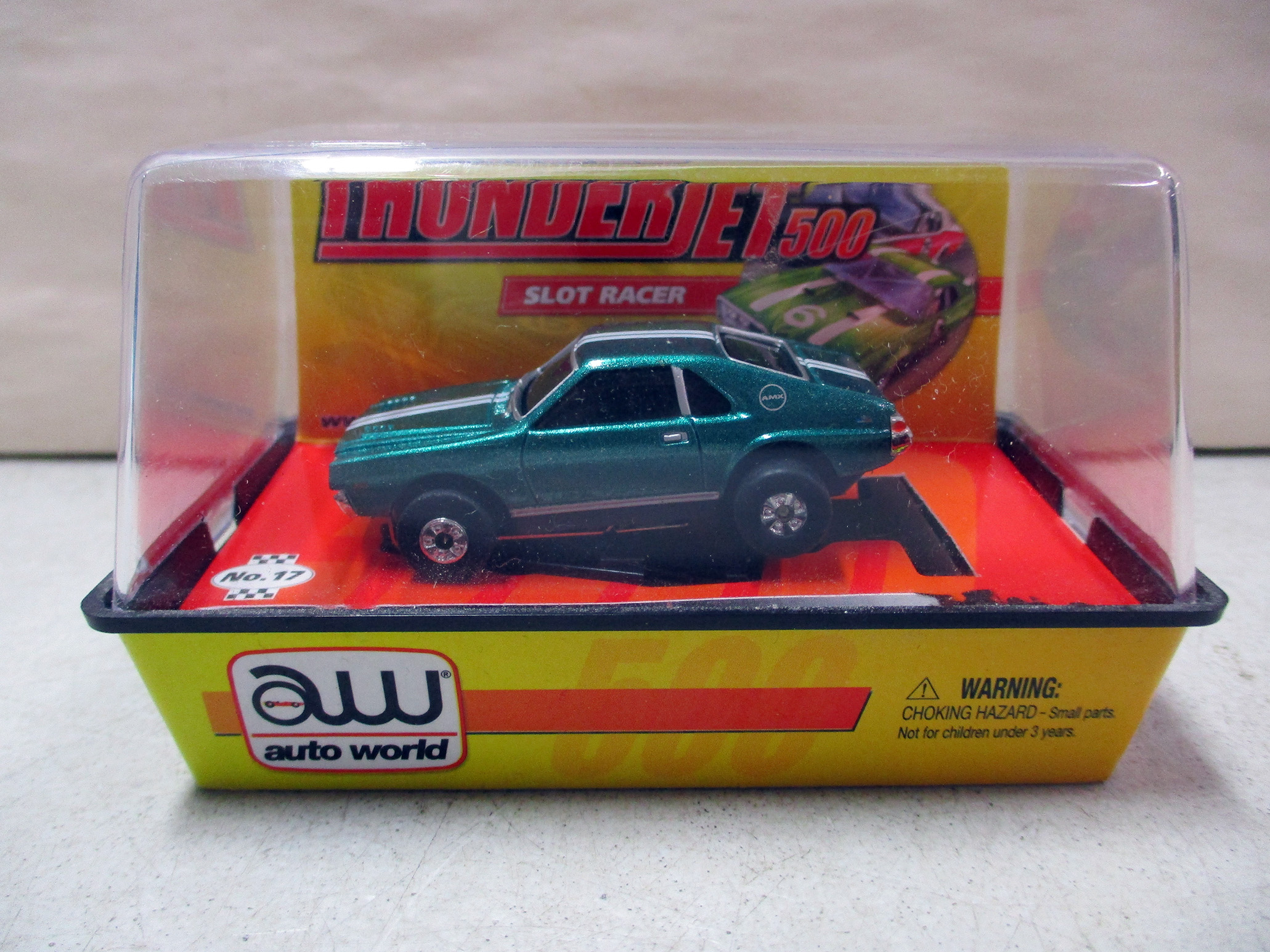 Auto World Thunderjet 500 slot car featuring a metallic green body and black detailing. Presented in its original packaging with vibrant graphics and clear plastic cover for protection. The car is approximately 1:64 scale and is compatible with slot car tracks. Packaging shows minor signs of handling but remains intact. (Click image to see high resolution version).