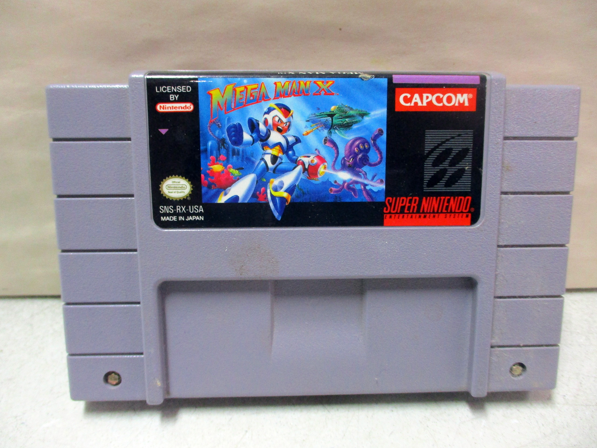 Mega Man X game cartridge for the Super Nintendo Entertainment System (SNES), produced by Capcom. The label features original artwork, and the cartridge shows moderate wear consistent with age and use. Manufactured in Japan. Fully compatible with standard SNES consoles. Includes no additional packaging or documentation. (Click image to see high resolution version).
