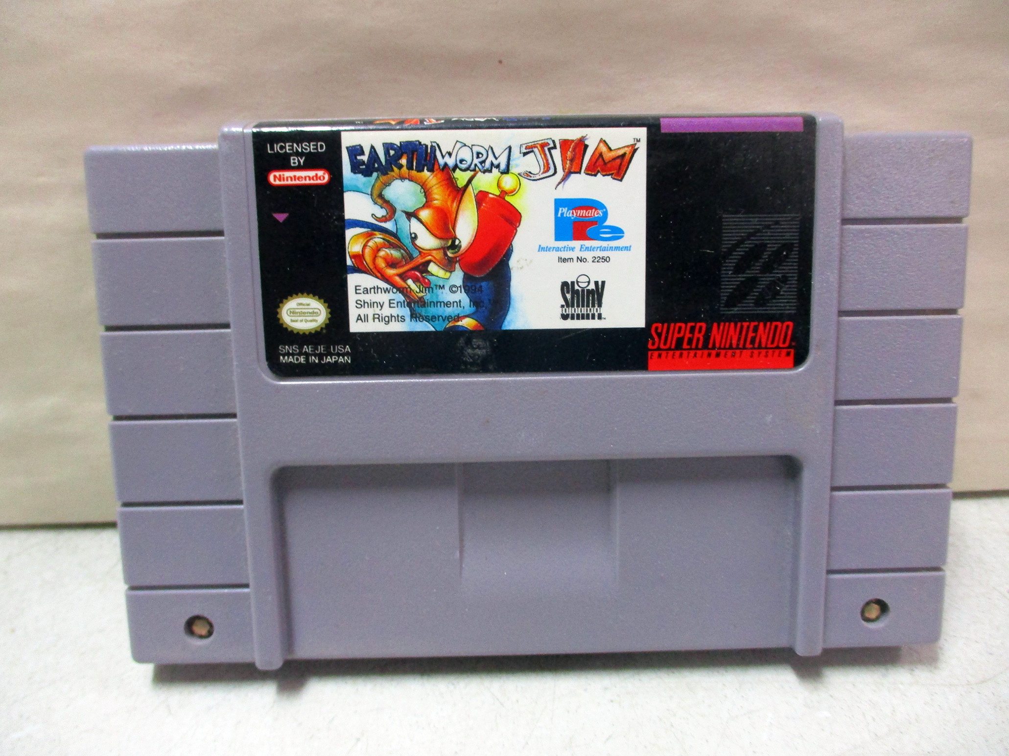 Earthworm Jim game cartridge for the Super Nintendo Entertainment System (SNES), featuring the original label artwork. Published by Shiny Entertainment and licensed by Nintendo. The cartridge shows visible signs of use but appears intact. Functionality and condition not verified and sold as-is. A popular title from the 1990s. (Click image to see high resolution version).