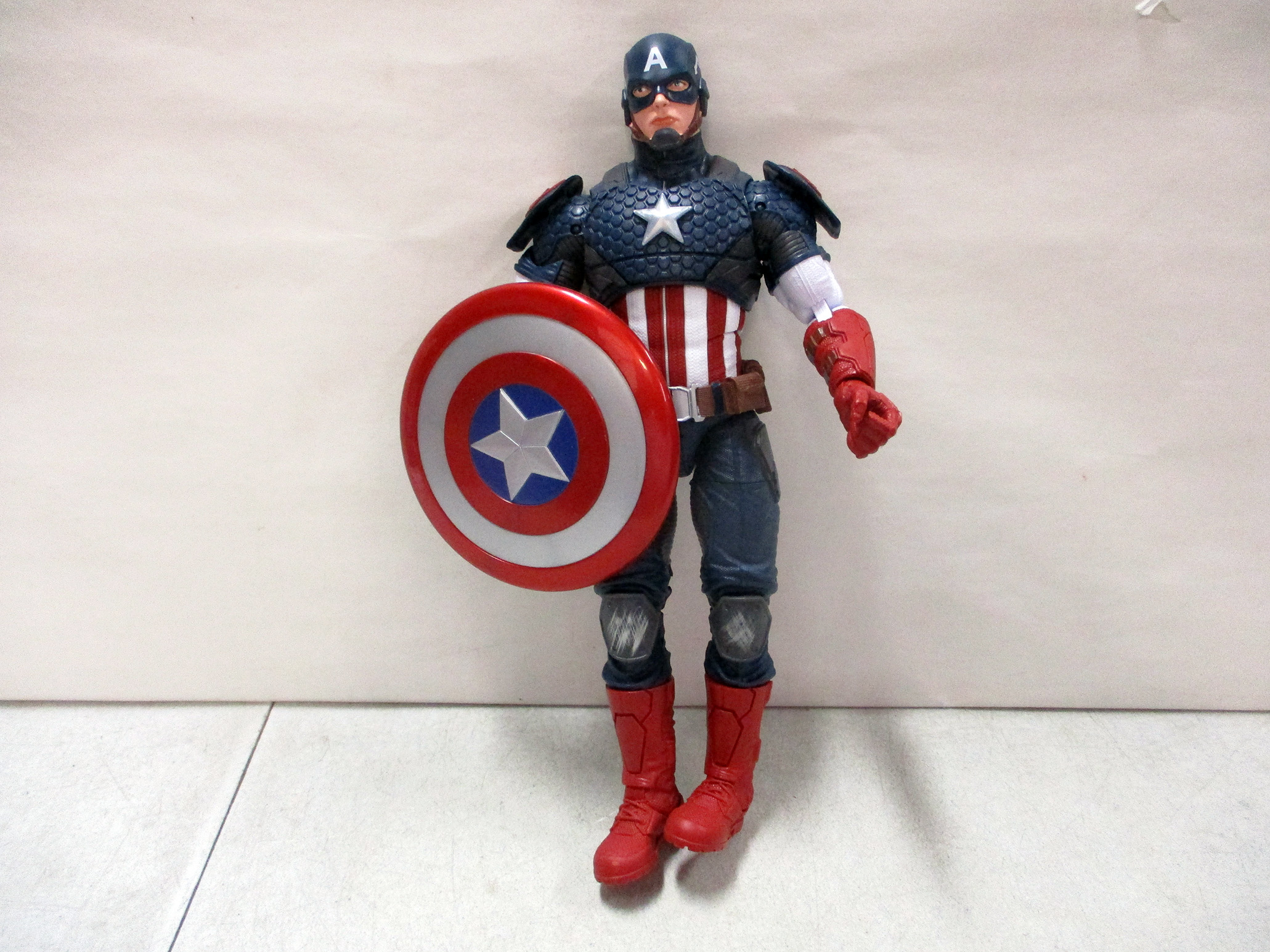 This is a Captain America action figure from the United States, made from plastic. It includes the iconic shield. Highly detail-oriented model suitable for collectors and fans. (Click image to see high resolution version).