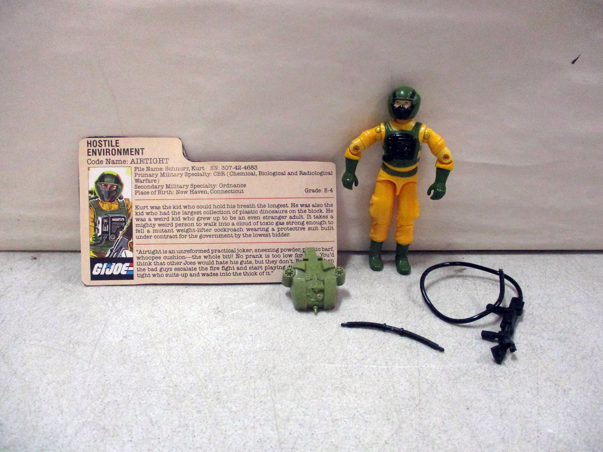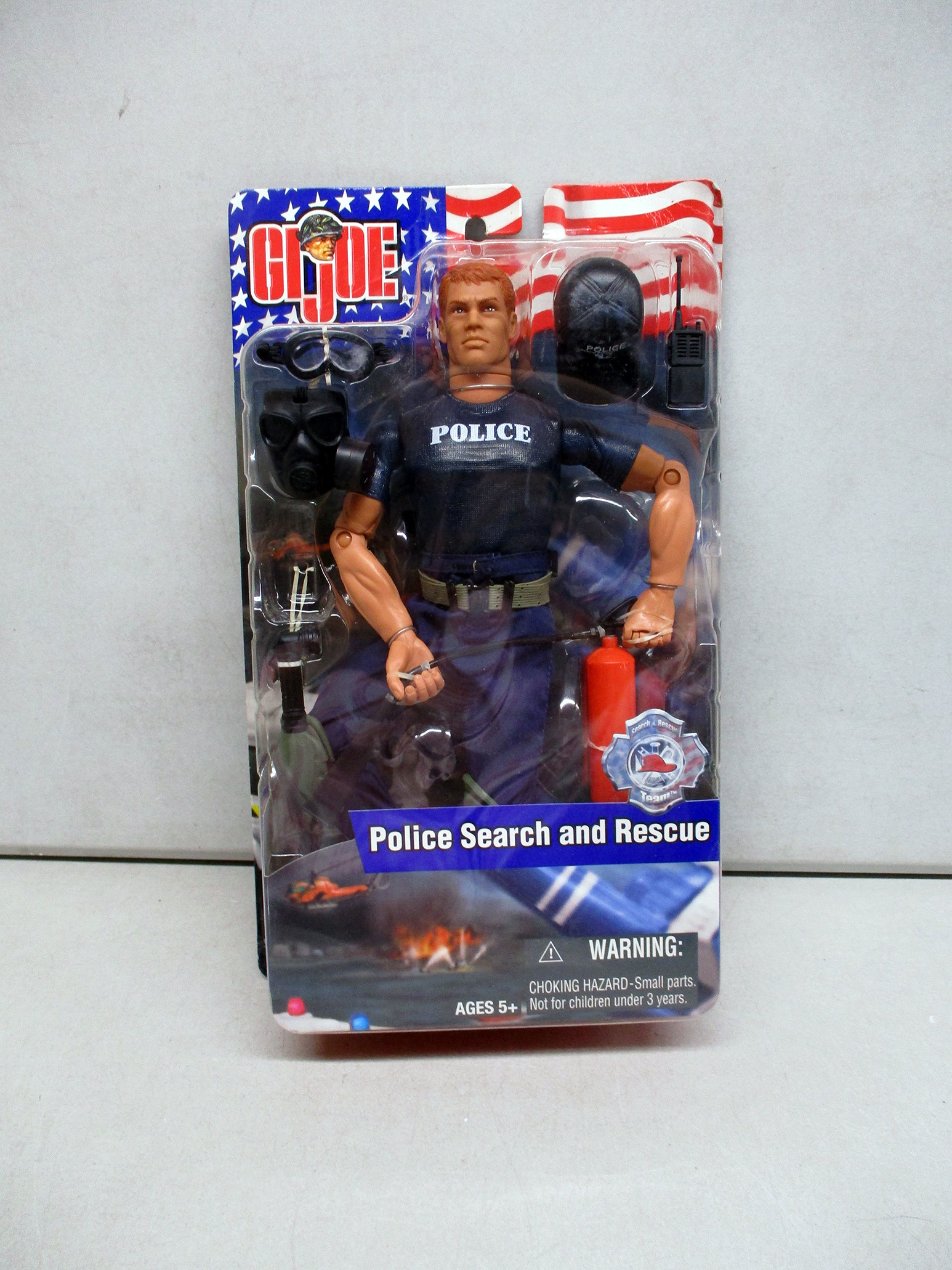 This G.I. Joe action figure represents a police search and rescue officer. Originating from the USA, it is made of plastic. The exact manufacturer and age are unspecified. The figure is still in its original packaging, which includes various accessories such as a gas mask, helmet, and walkie-talkie. Suitable for ages 5 and up, it carries a choking hazard warning for small parts. (Click image to see high resolution version).