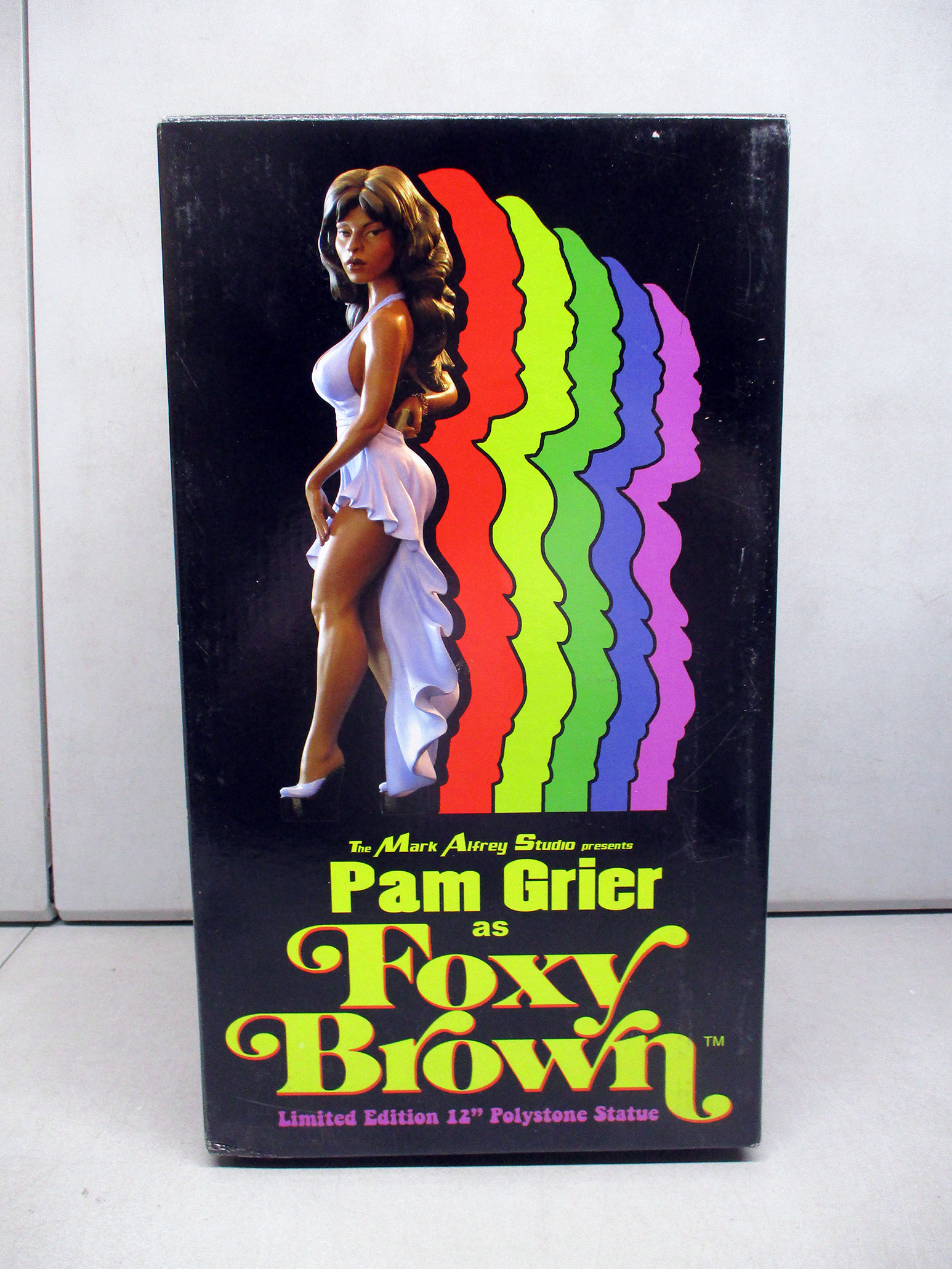 This is a limited edition 12-inch polystone statue of Pam Grier as Foxy Brown. Designed by Mark Alfrey Studio, it was made in the USA. The statue is a collectible item. (Click image to see high resolution version).
