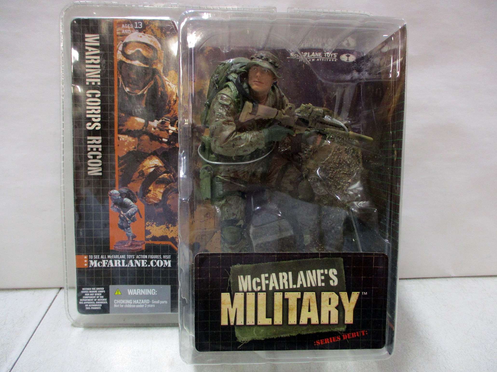 This action figure is from the McFarlane's Military Series Debut, depicting a Marine Corps Recon soldier. Made by McFarlane Toys in the USA, it is crafted from plastic. Suitable for ages 13 and up. (Click image to see high resolution version).