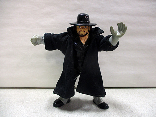 This is a vintage zombie action figure from the United States, made of plastic and cloth materials. It features a painted face and wears a cloth outfit. The figure has signs of wear but remains a collectible item for enthusiasts. (Click image to see high resolution version).