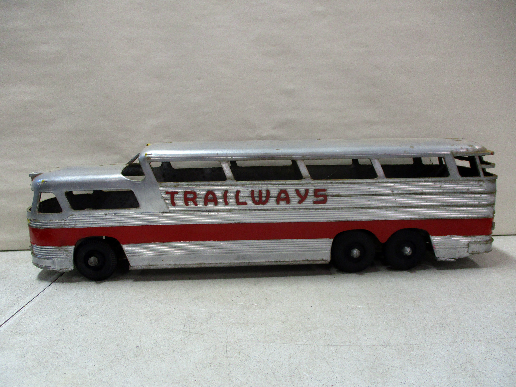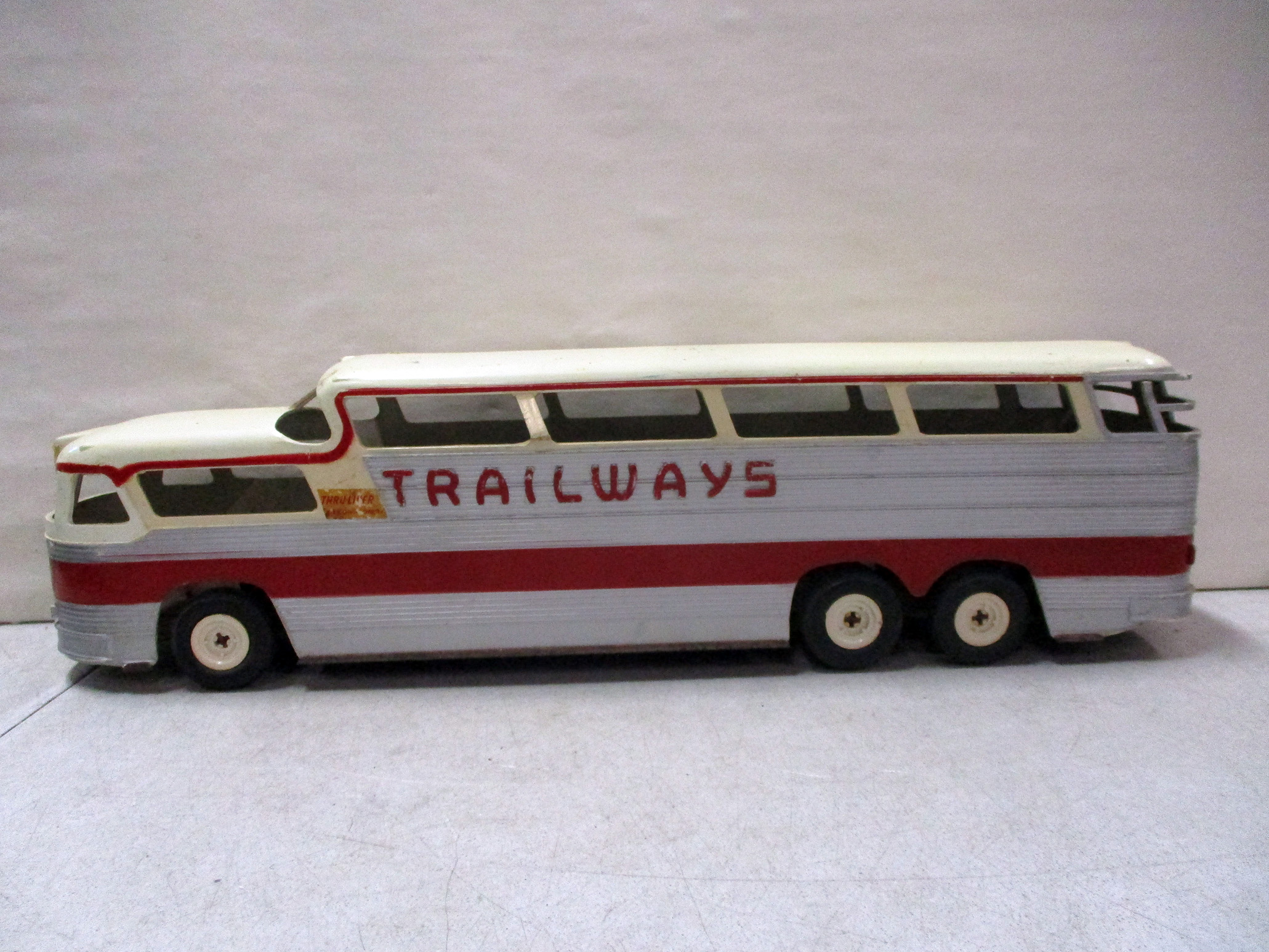 This is a vintage tin toy bus from the USA, featuring the iconic Greyhound logo. Made of pressed tin, it dates back to the mid-20th century. The bus showcases significant detailing and has functional wheels. Its exact maker is unknown. (Click image to see high resolution version).