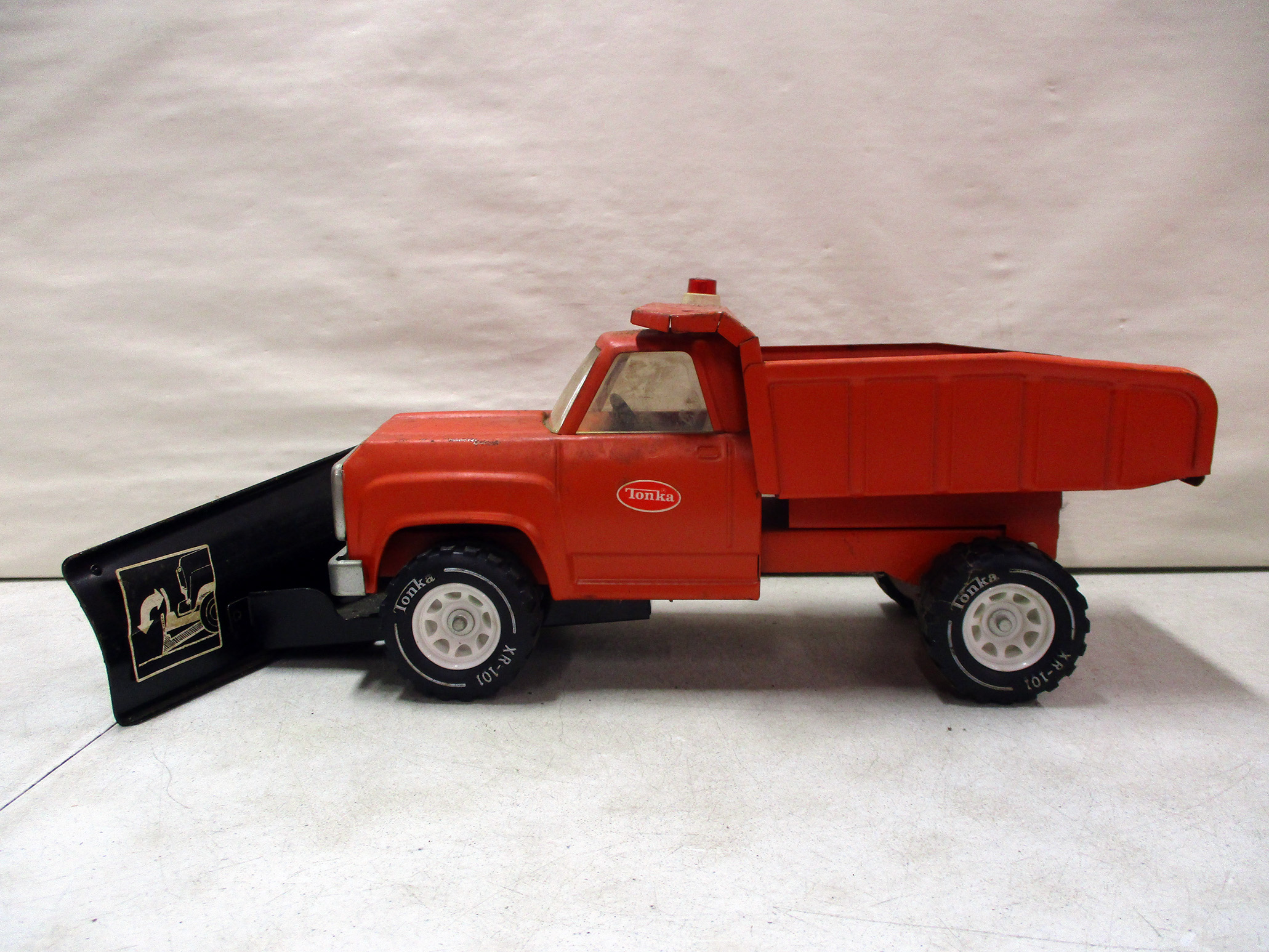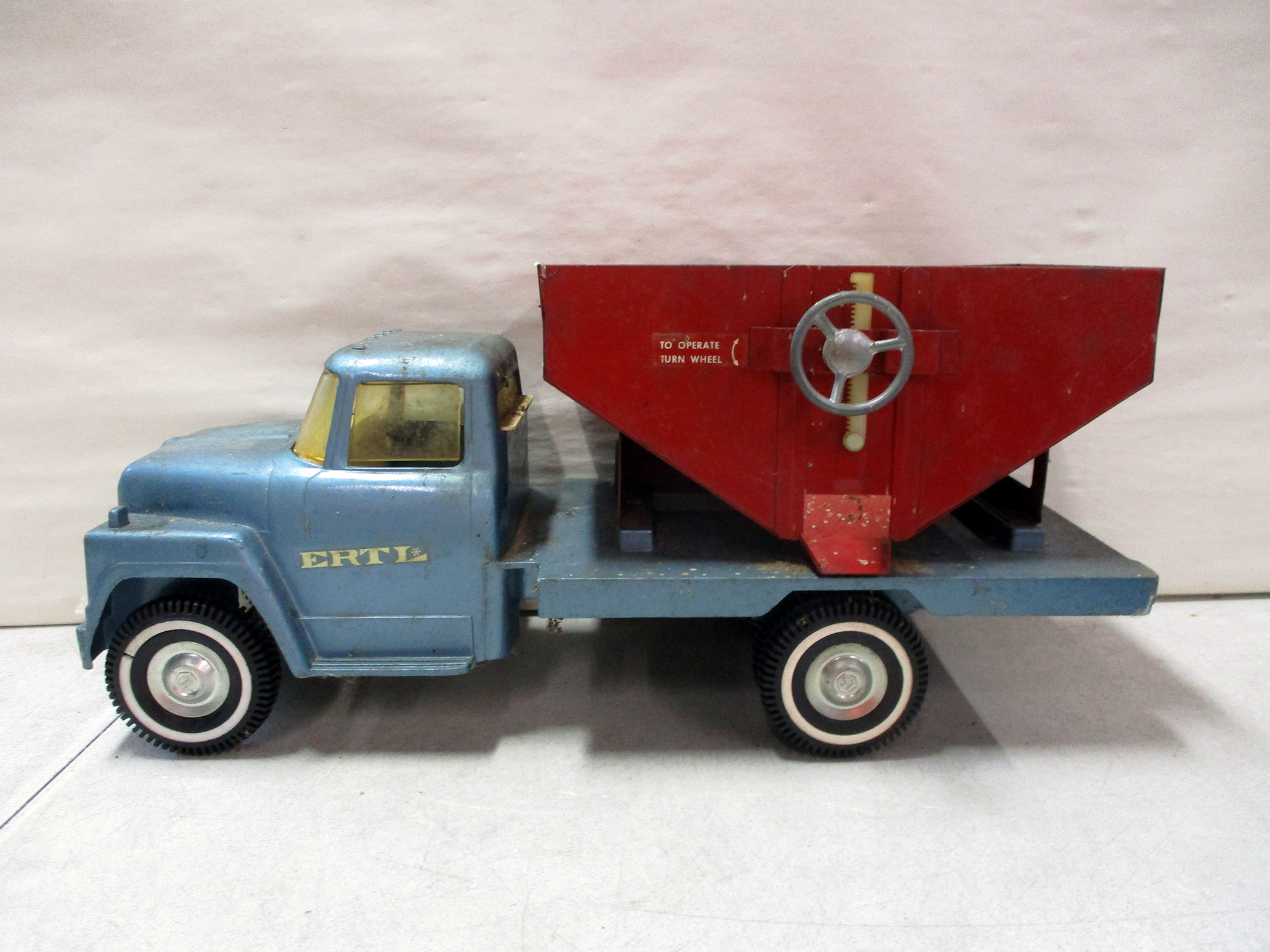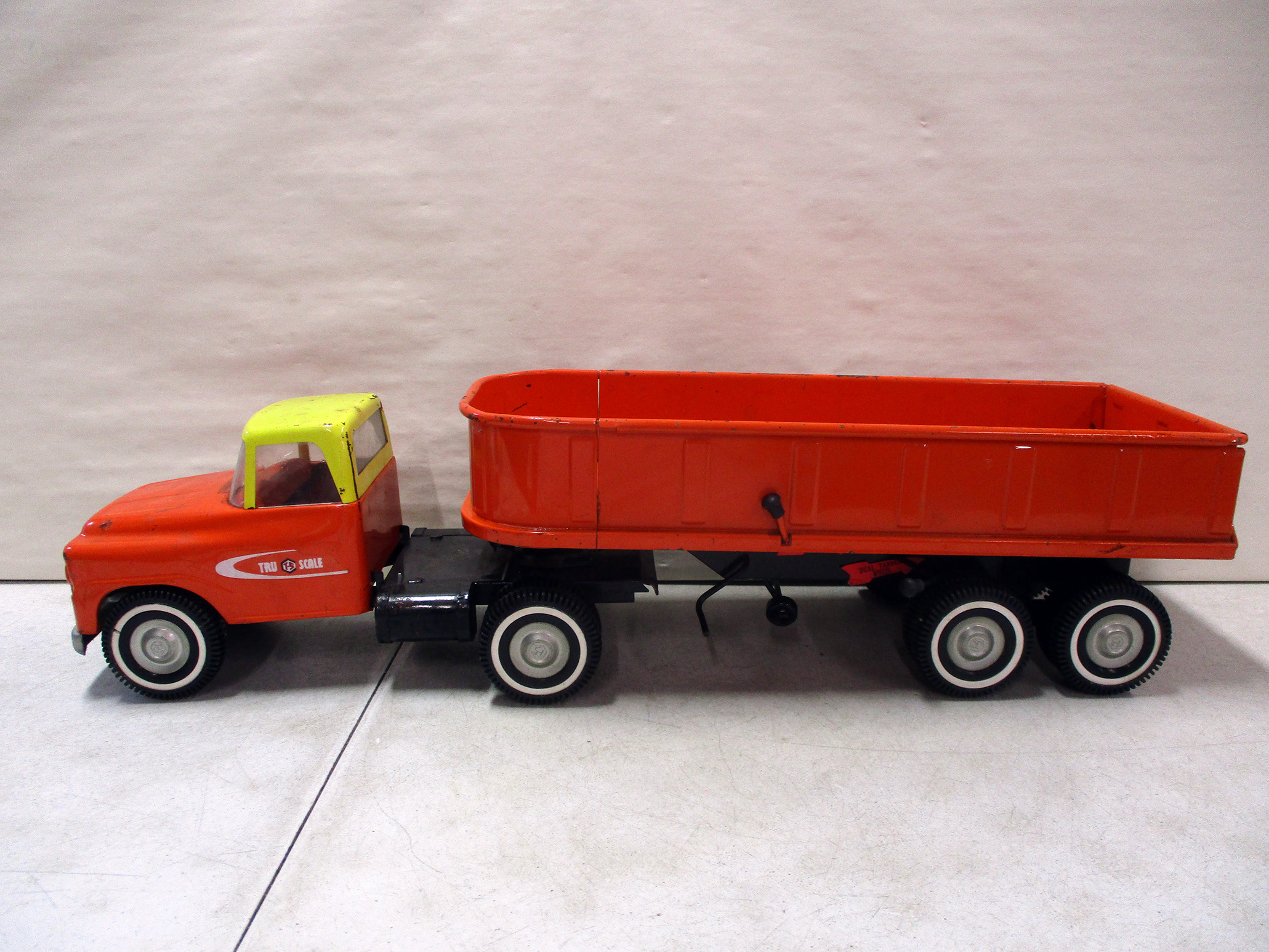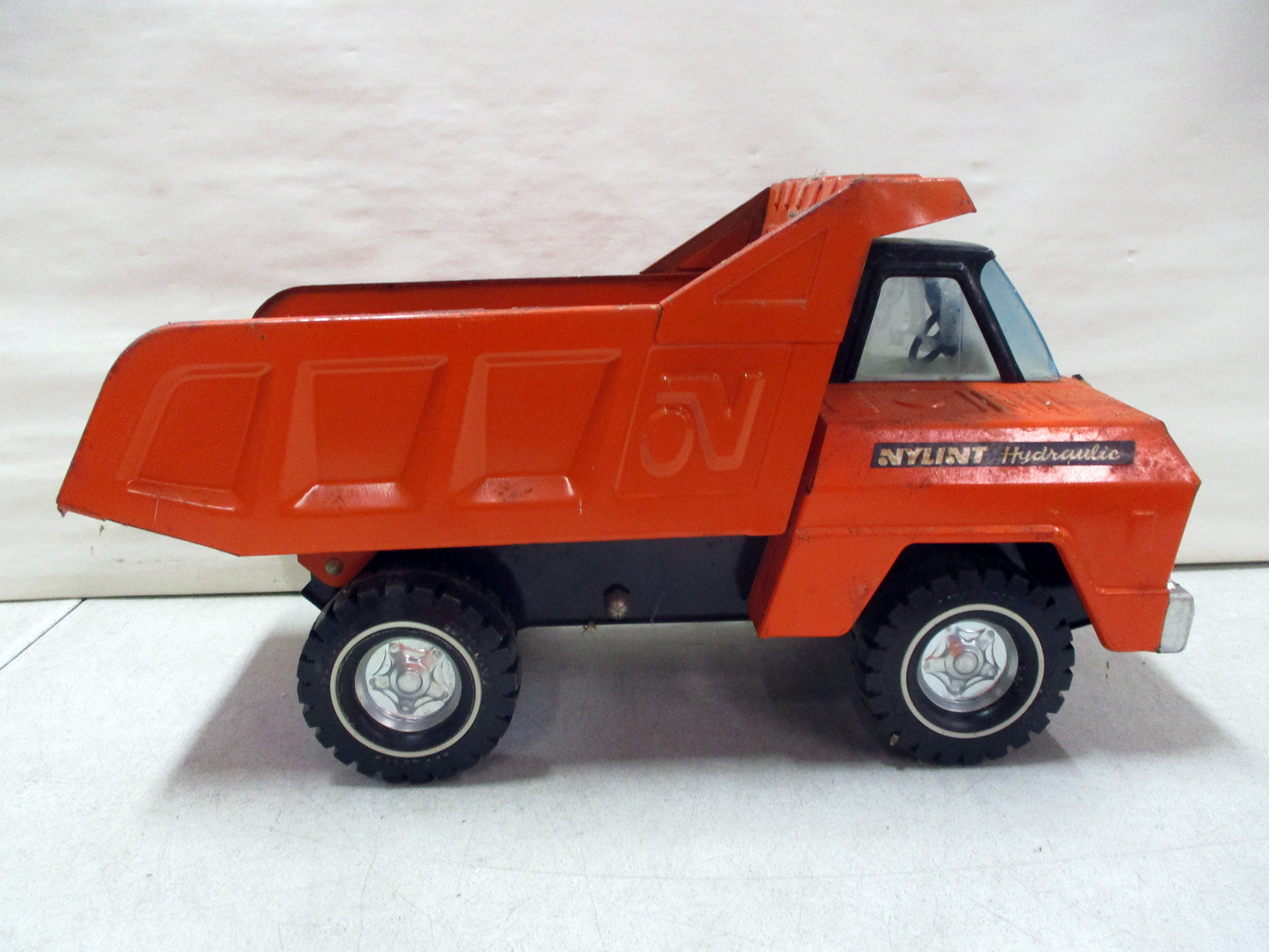 This is a vintage toy truck from the United States, made of metal. It features a State Hi-Way Dept 975 decal on the door and a chain detail at the rear. The toy is orange in color and includes a small light on top of the cab. The manufacturer is unknown. Likely dating from the mid-20th century, this toy truck is a collectible item for vintage toy enthusiasts. (Click image to see high resolution version).