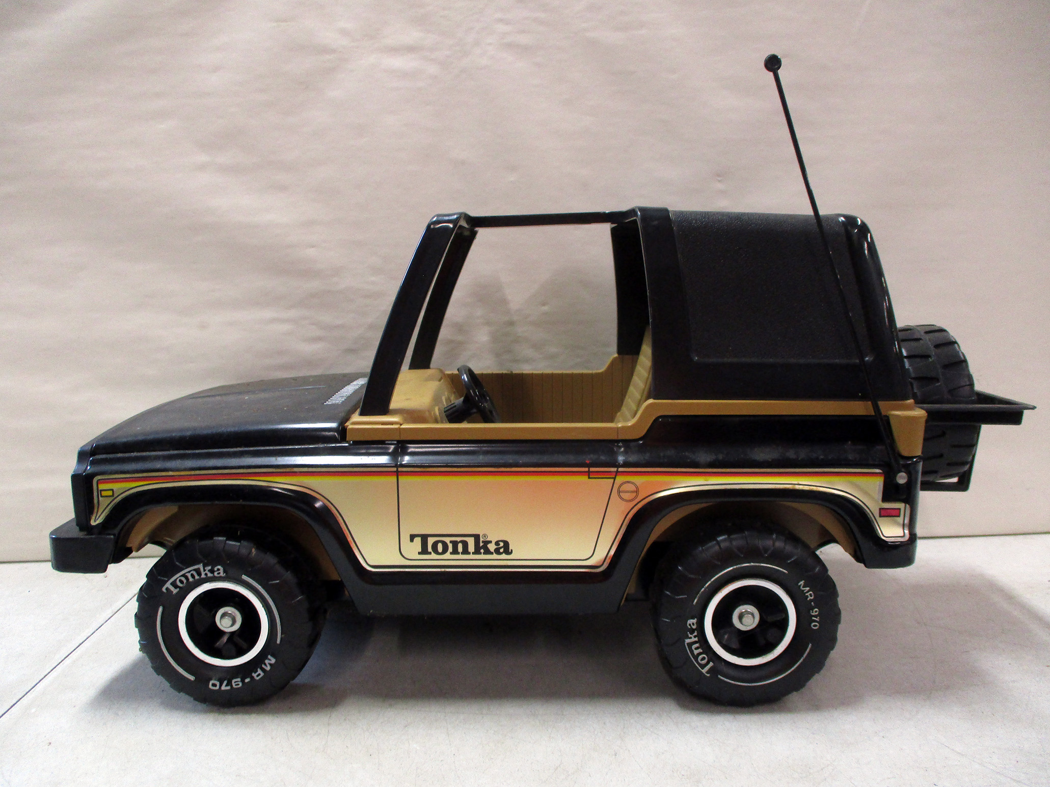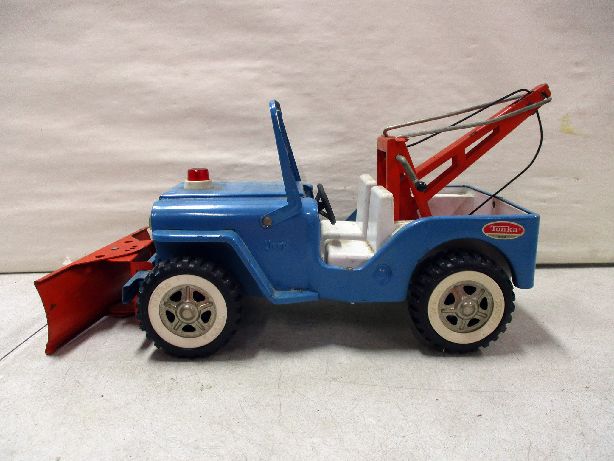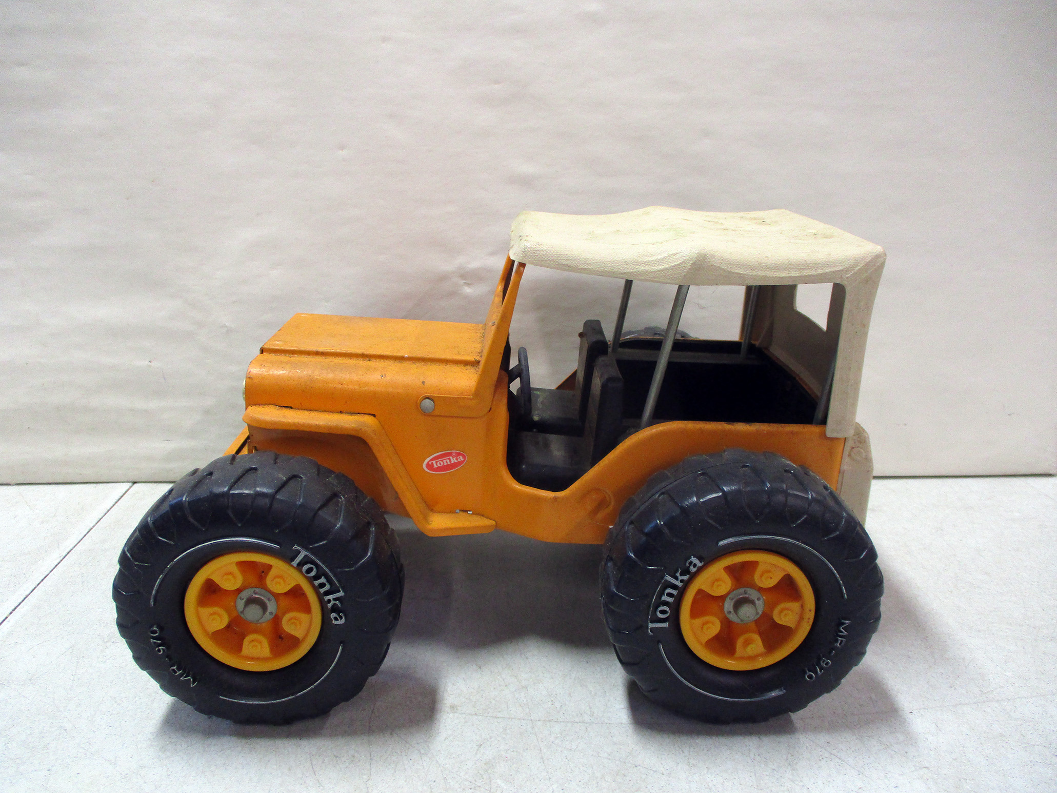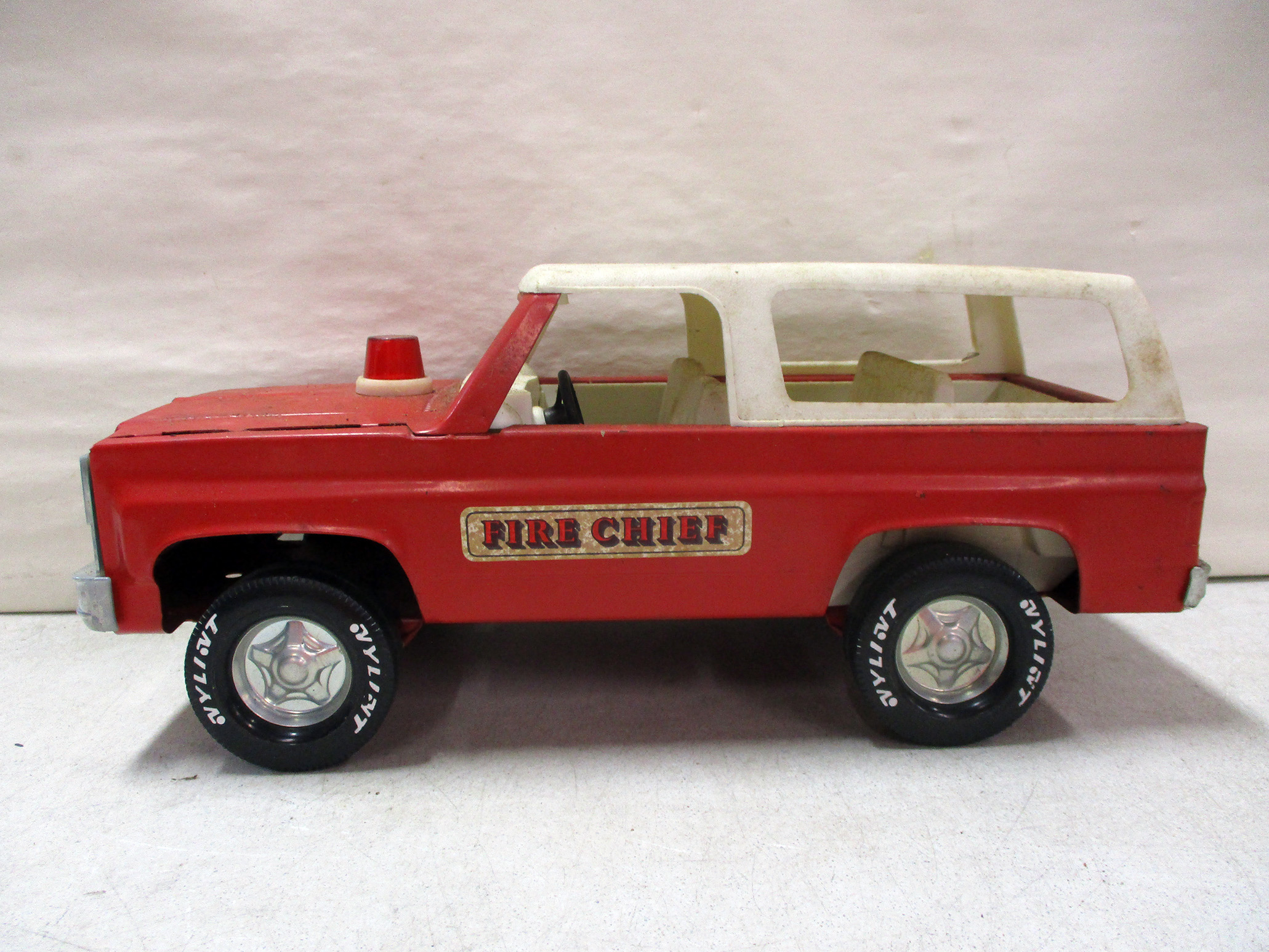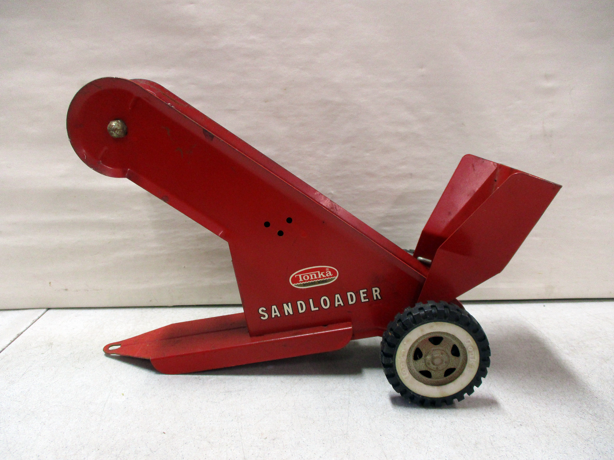 This is a vintage toy truck from the United States, made of metal. It features a State Hi-Way Dept 975 decal on the door and a chain detail at the rear. The toy is orange in color and includes a small light on top of the cab. The manufacturer is unknown. Likely dating from the mid-20th century, this toy truck is a collectible item for vintage toy enthusiasts. (Click image to see high resolution version).