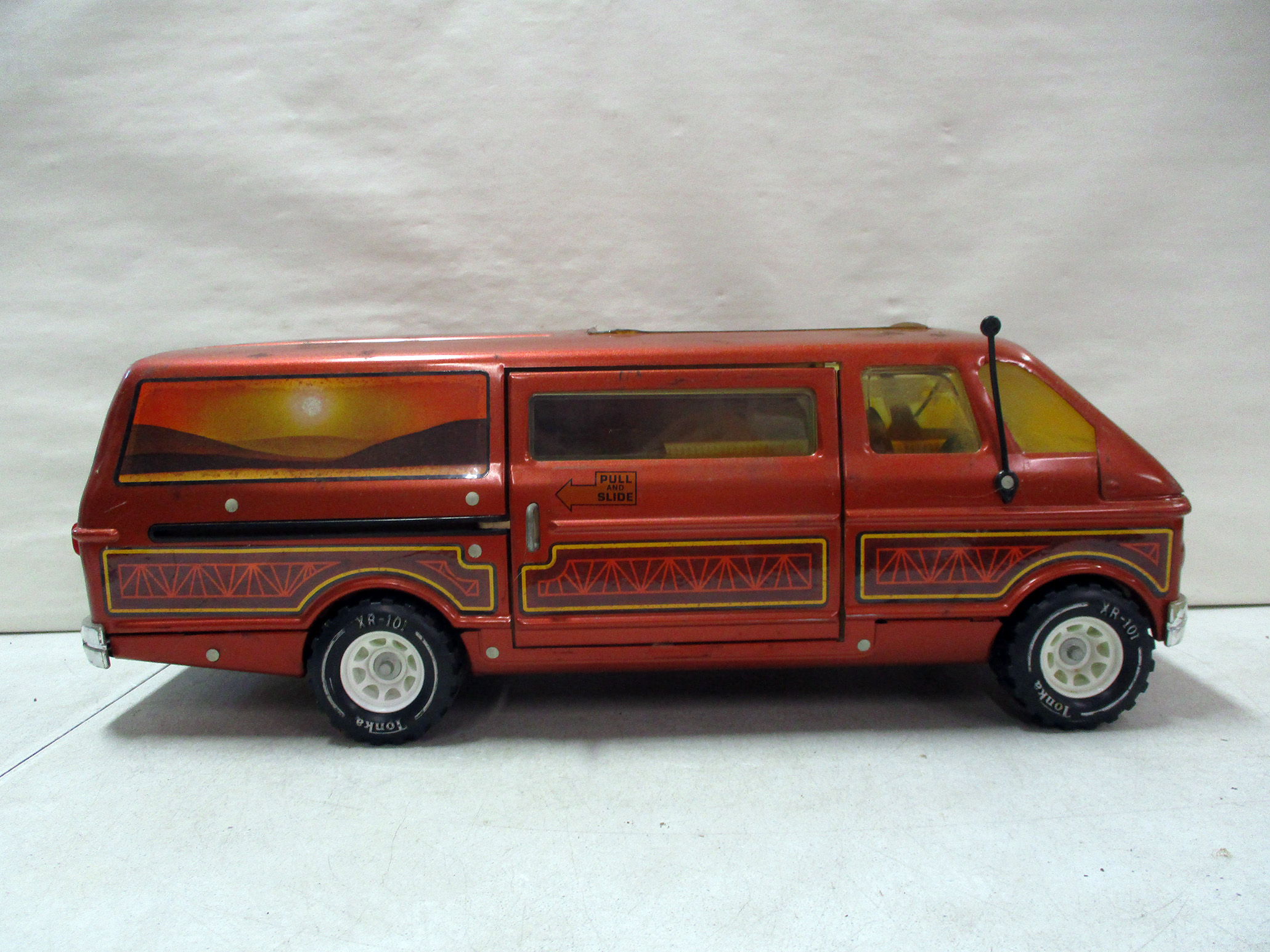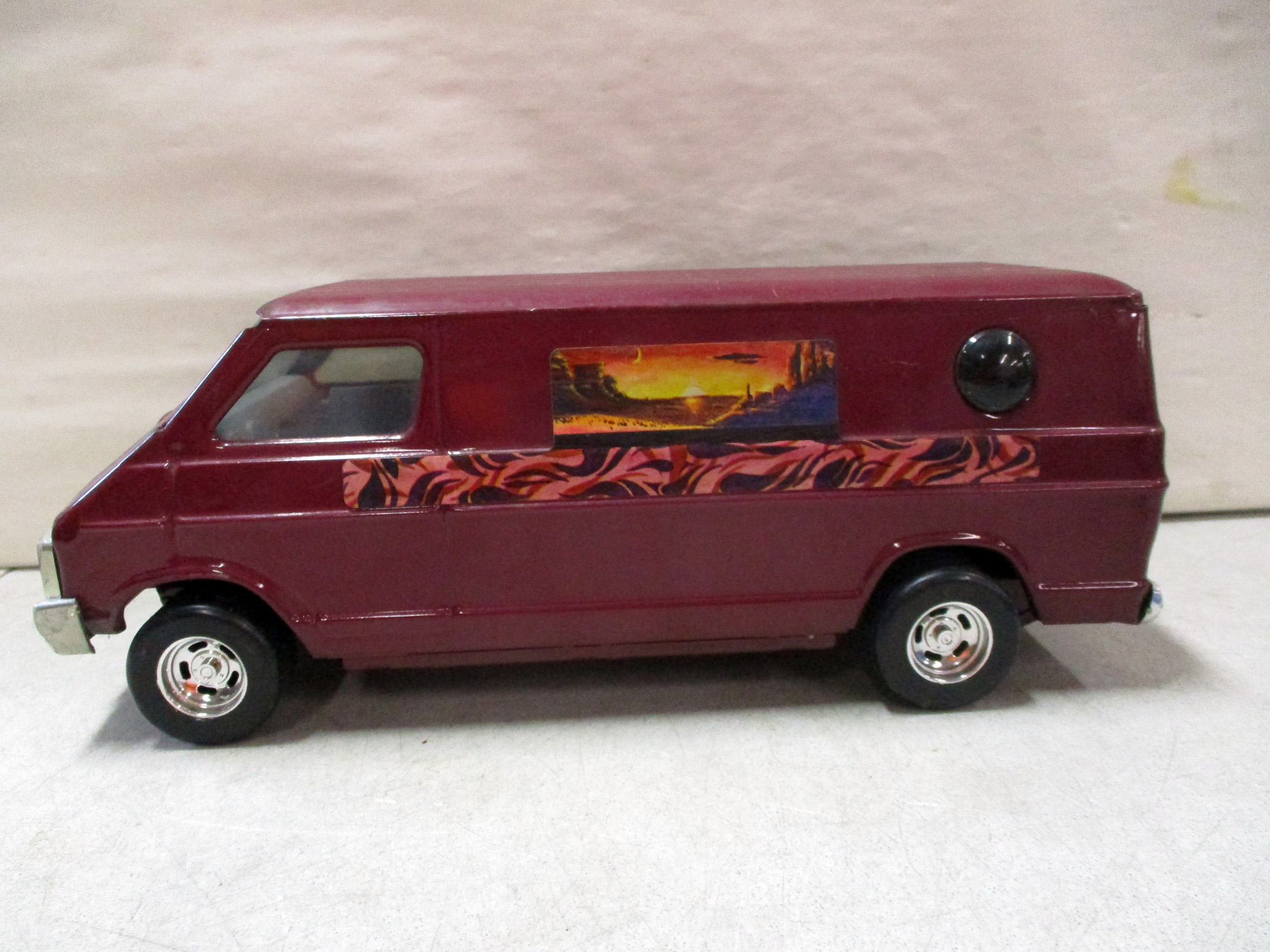 This Hot Wheels Super Van die-cast toy car was manufactured in the United States. Made primarily of metal, it features a blue body with distinctive flame decals and 'Super Van' branding. This model is a product of Mattel and dates back to the 1970s. (Click image to see high resolution version).