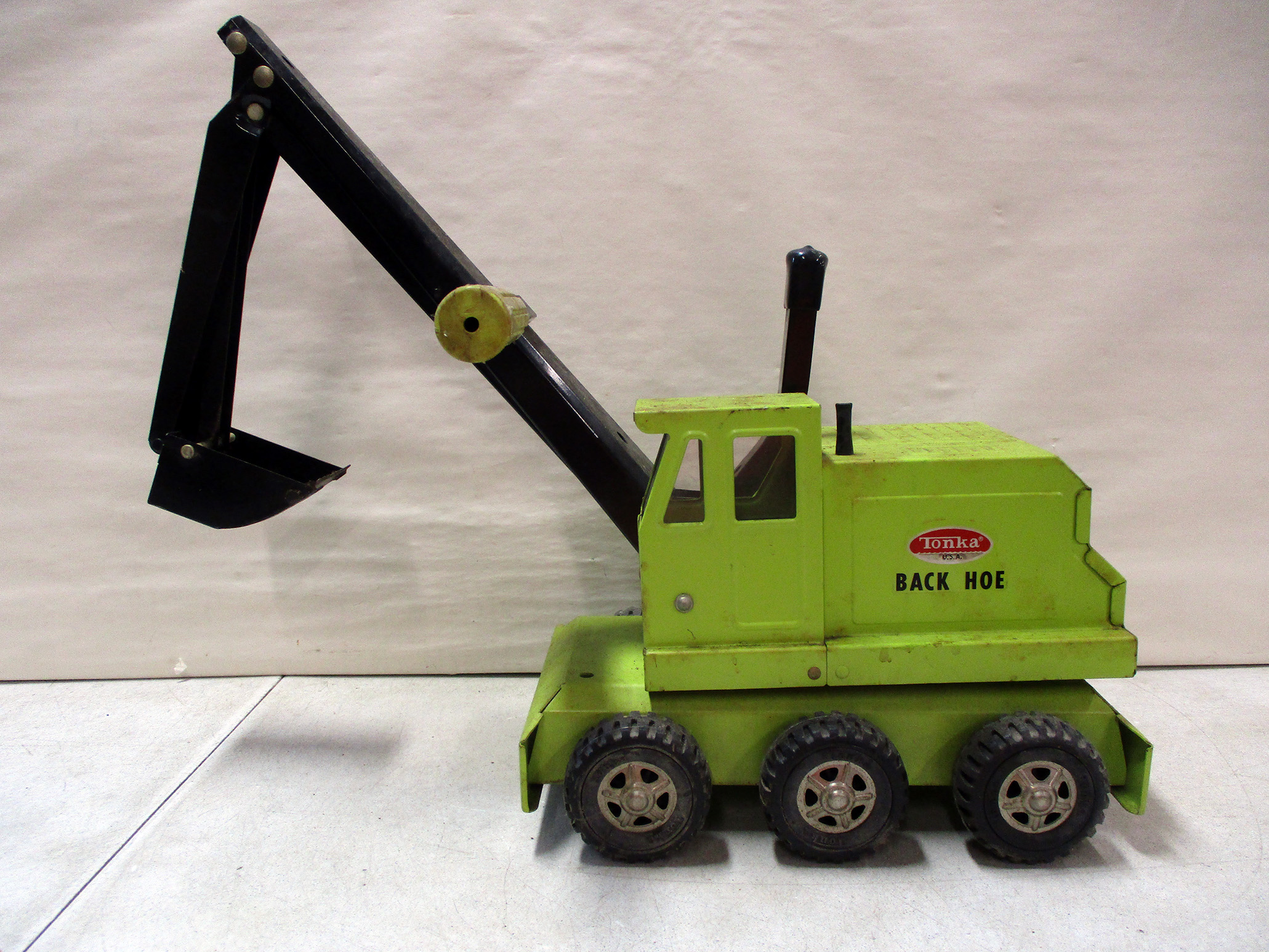 Green-colored die-cast construction loader toy featuring realistic details. It includes four large wheels, a functional front bucket, and a detailed driver's cab. Likely representing a scale model of a heavy-duty loader vehicle. Condition appears well-maintained without visible significant damage. Suitable for display or collection purposes. (Click image to see high resolution version).