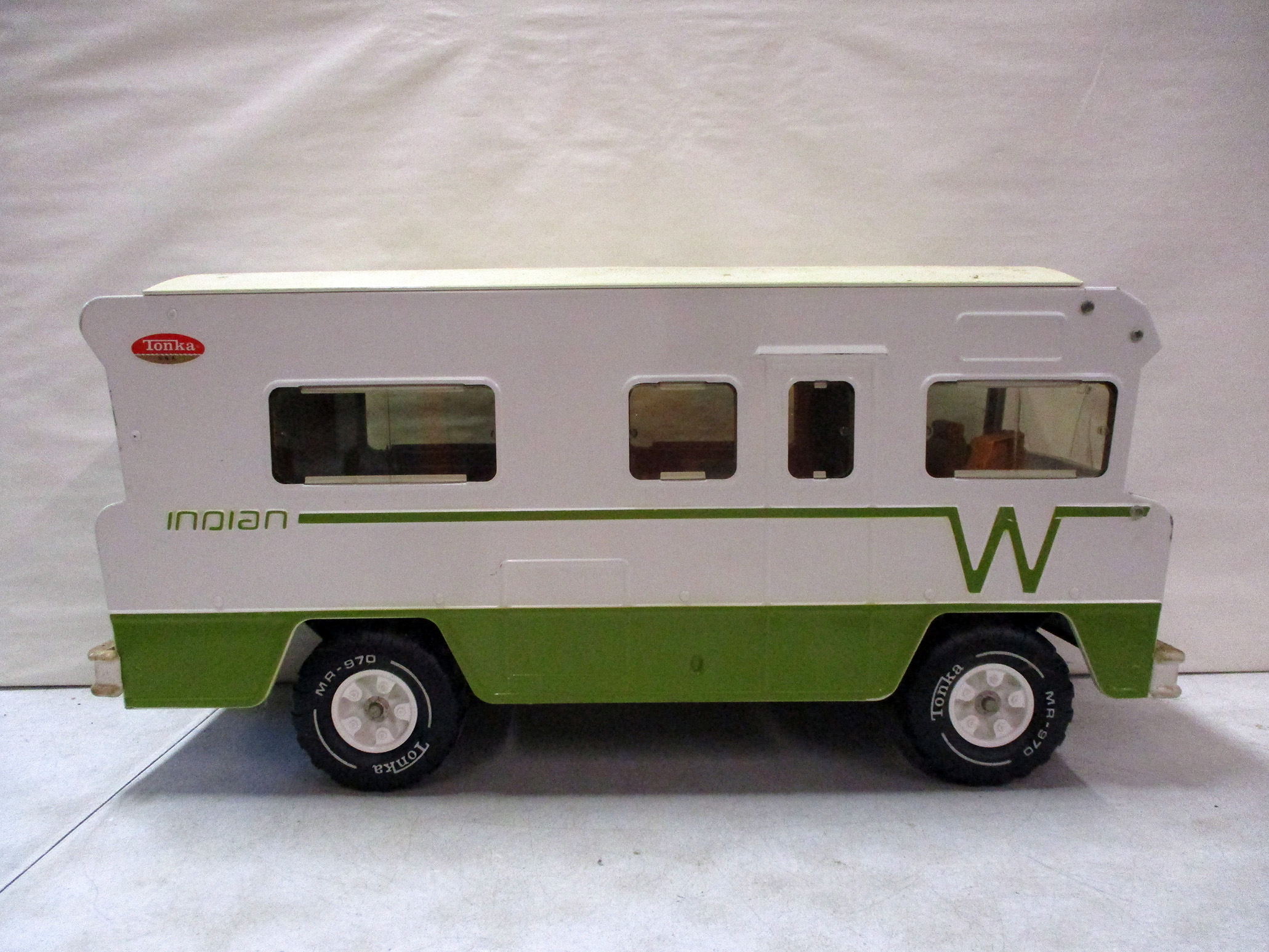 This is a vintage die-cast Hot Wheels toy car from the USA. Made of metal and plastic, it features the Racing Team logo on the side. Likely dating back to the 1980s or 1990s, it showcases a unique camper design with detailed accents typical of that era's Hot Wheels collections. (Click image to see high resolution version).